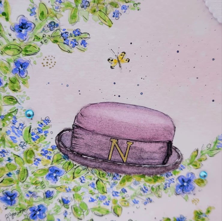 Hand-drawn and created with linen textured card, watercolour card and artist grade watercolour paints. The sentiment is personalised for the recipient. Finished with grey fineliner pen and decorated with three little pale blue crystals.