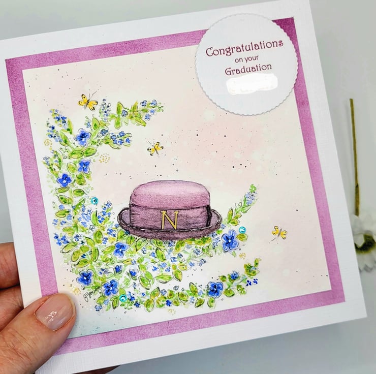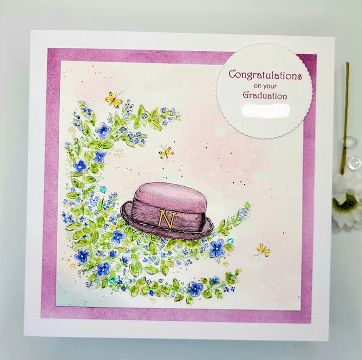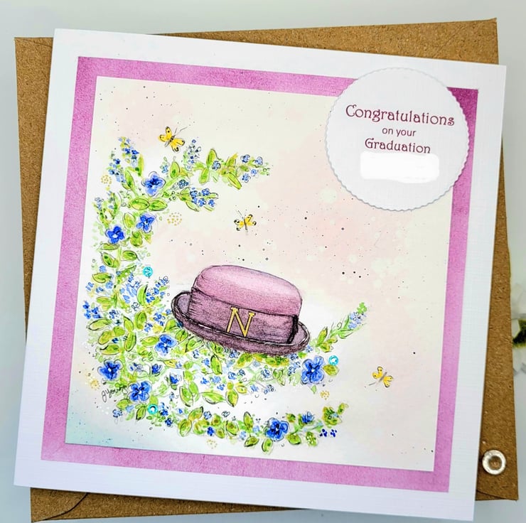 A specially created bespoke card for a custom order. The card is handpainted and based on a specific design and congratulations theme. The card measures 14 x 14 cms and is blank inside for writing a personal message. Supplied with a 100% recycled brown kraft paper envelope.