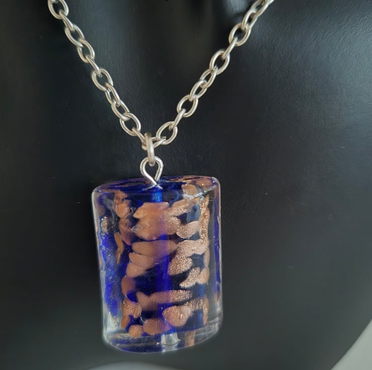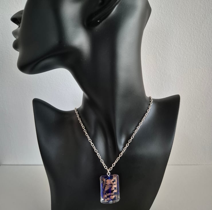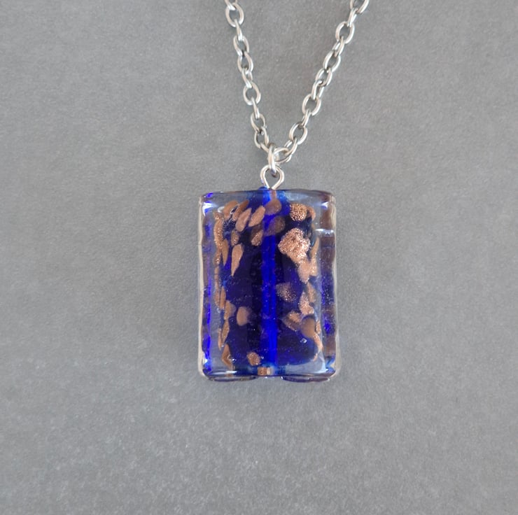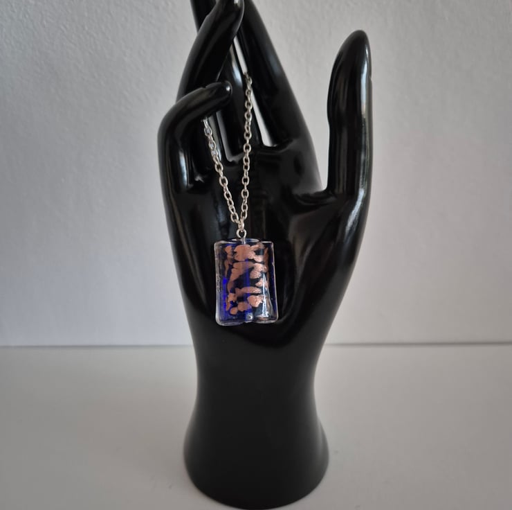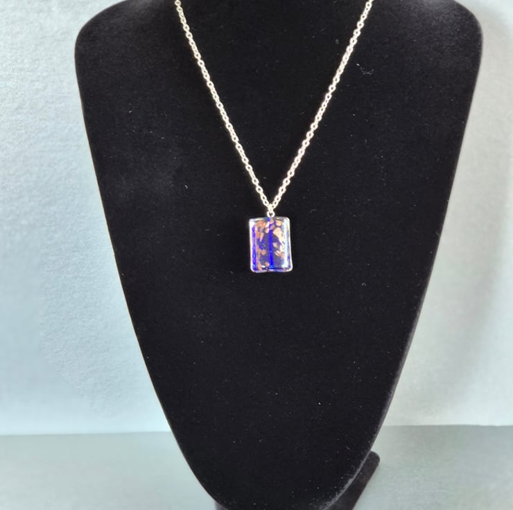Elegant necklace with a glass rectange of blue and bronze. Perfect for any occasion. Glass size is 3cm length, 2 cm width. Silver plated chain 48cm length.