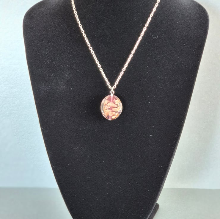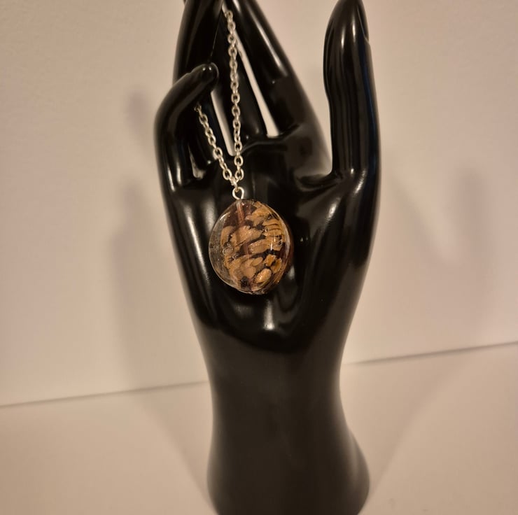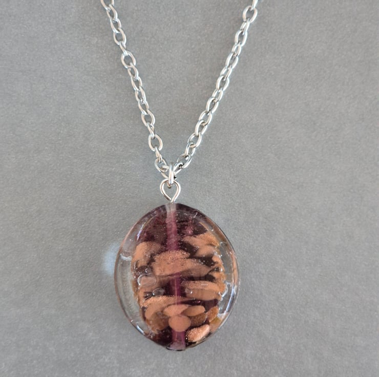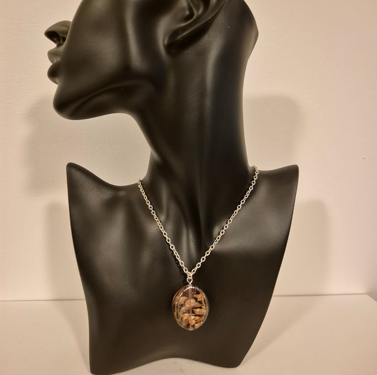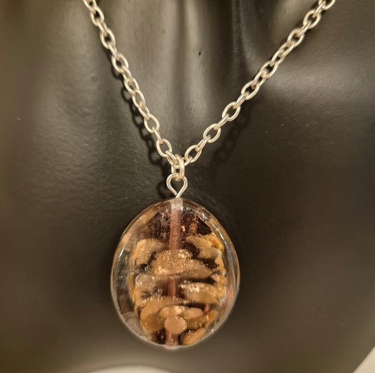 Handcrafted elegant, oval necklace with bronze foil. Oval size is 3cm length, 2.5cm width. Silver plated chain 46cm.