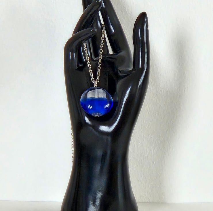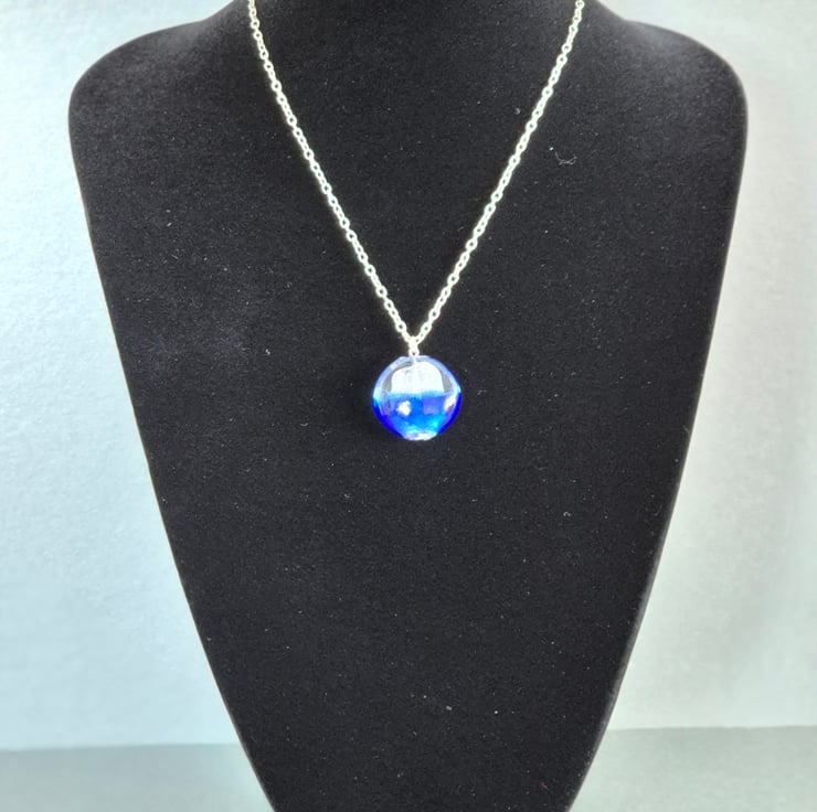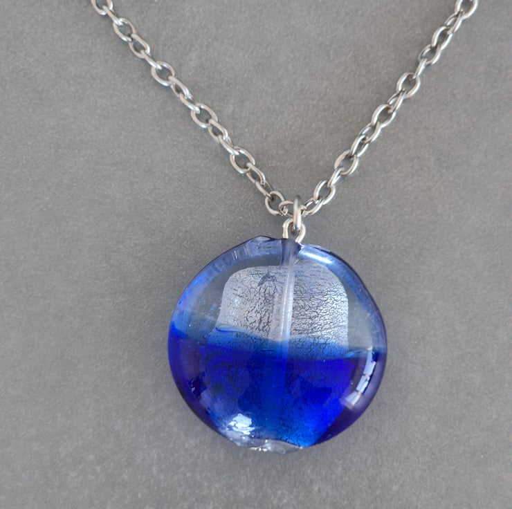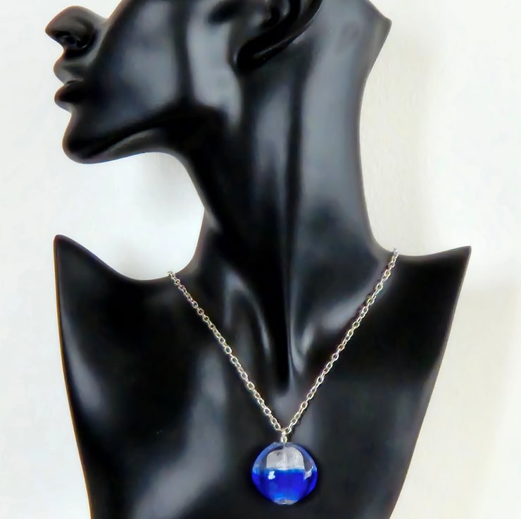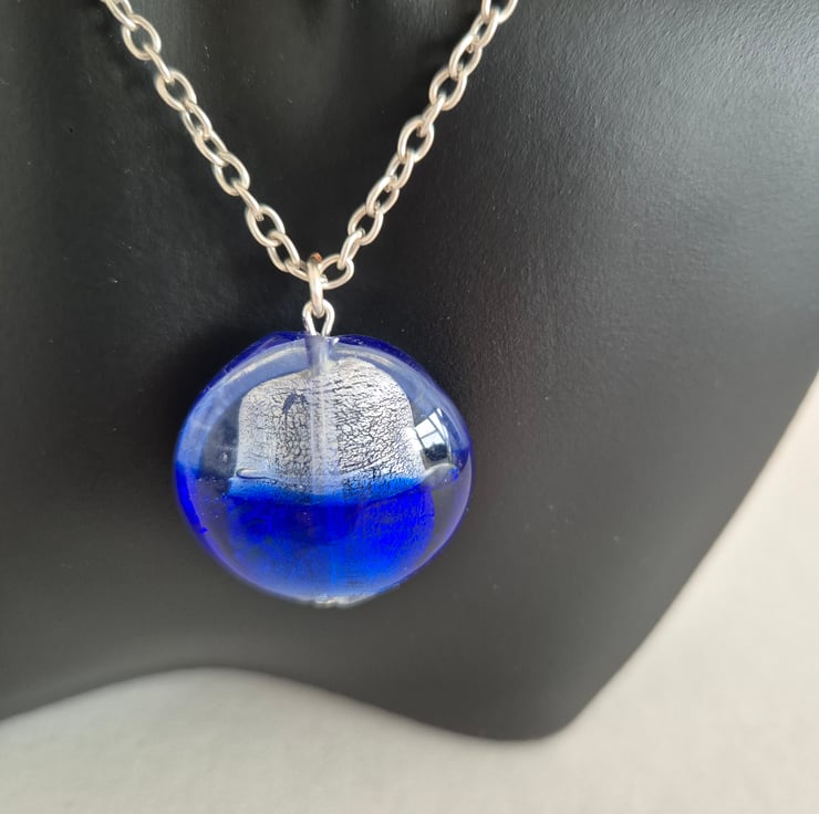 Handcrafted, bright blue glass orb shaped necklace with embedded silver foil. Diameter of glass disc is 3cm. Chain is silver plated and 46cm length. Lobster clasp fastening.