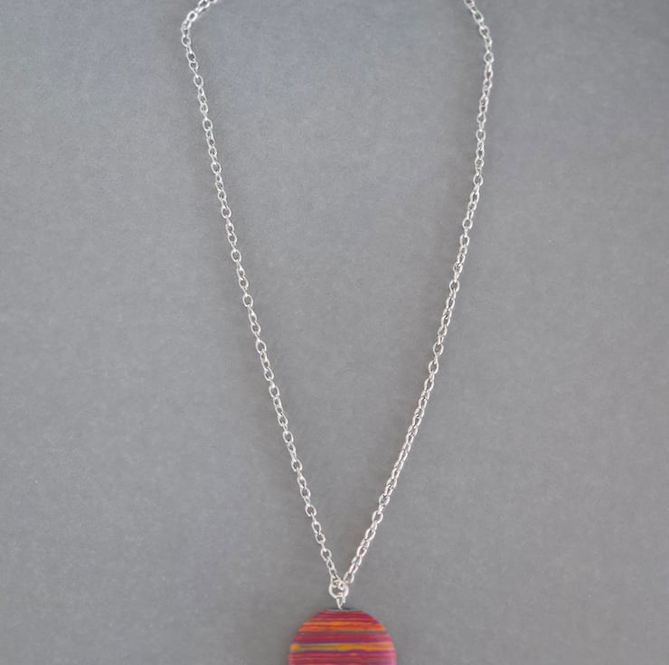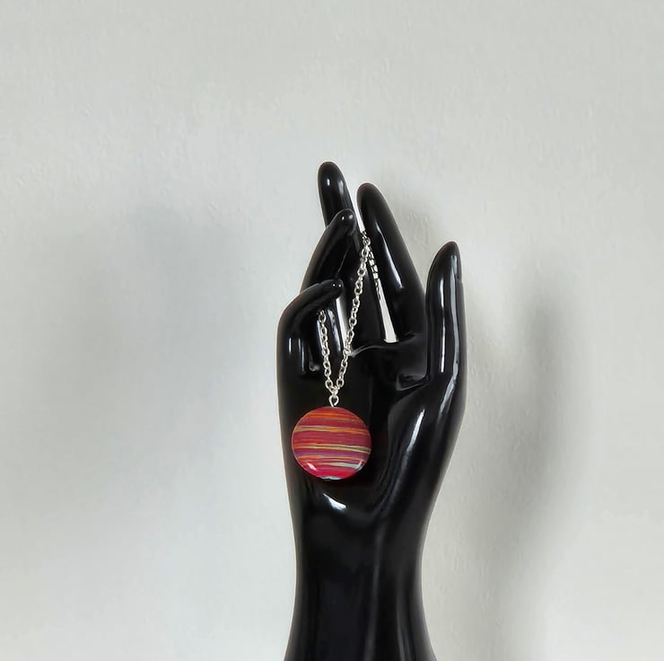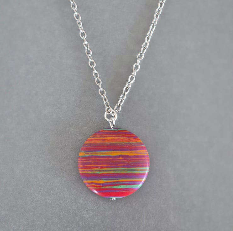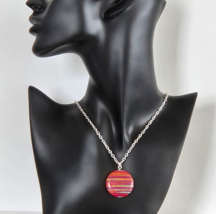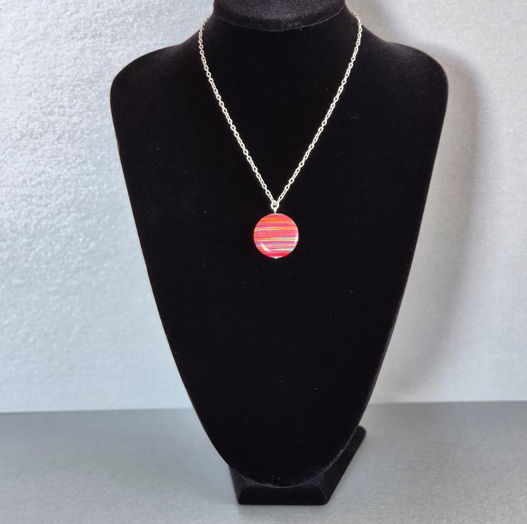 Handcrafted, pretty pink stripe resin necklace. Disc is 3cm diameter. Chain is silver plated and 45cm length.