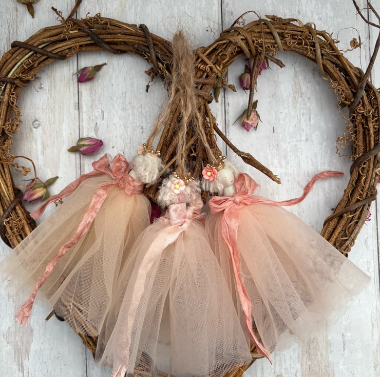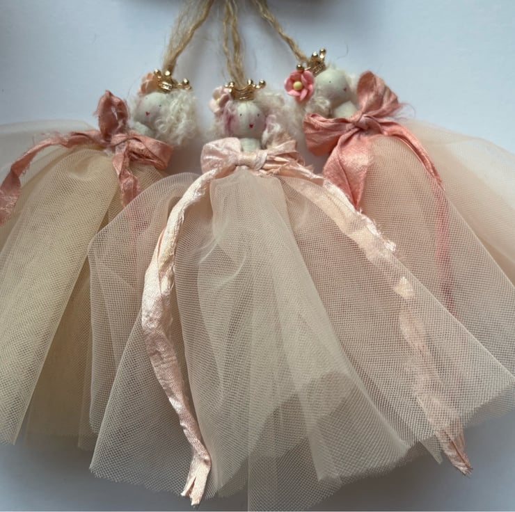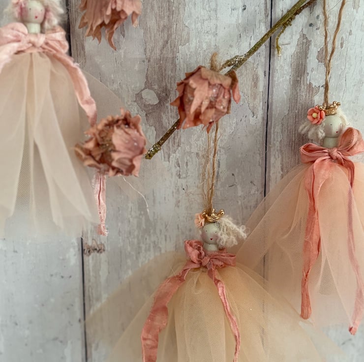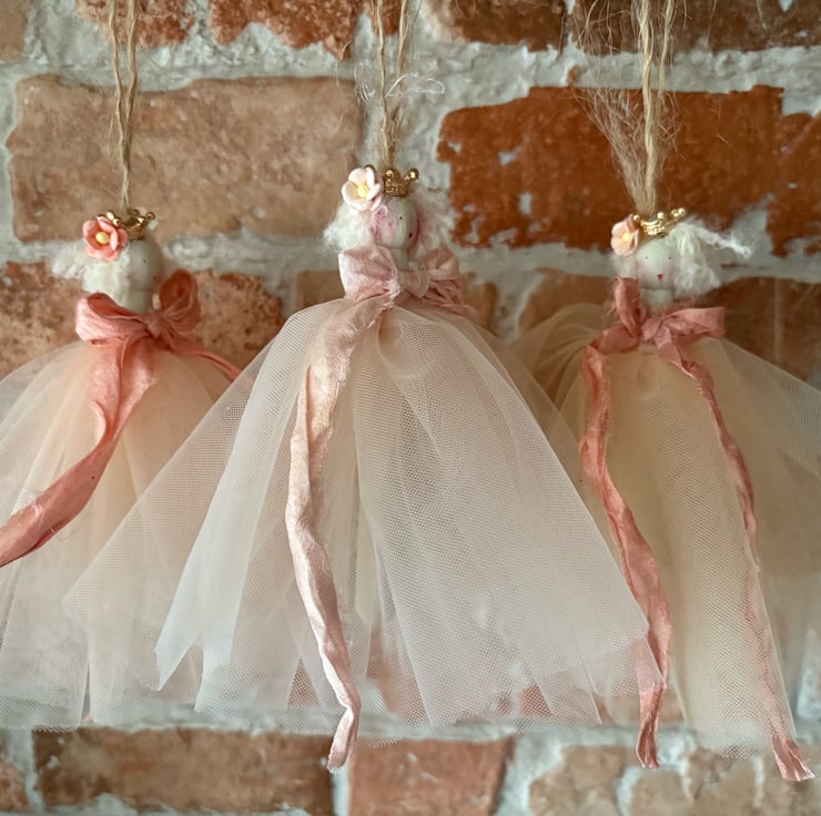Perfectly peach … this set of three peg dolls are hand painted and dressed in their finest tulle in very subtle shades of peach. Finished with a vintage peach ribbon and a pretty peach mulberry flower in her mohair wool hair.