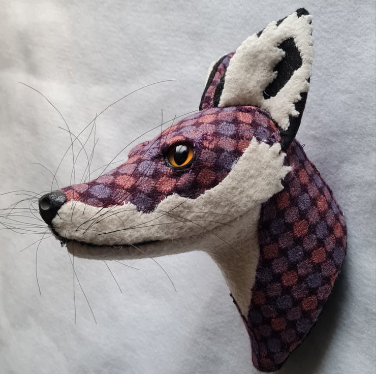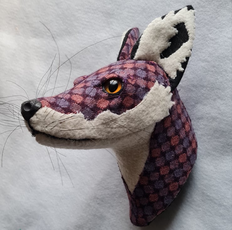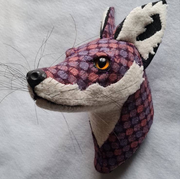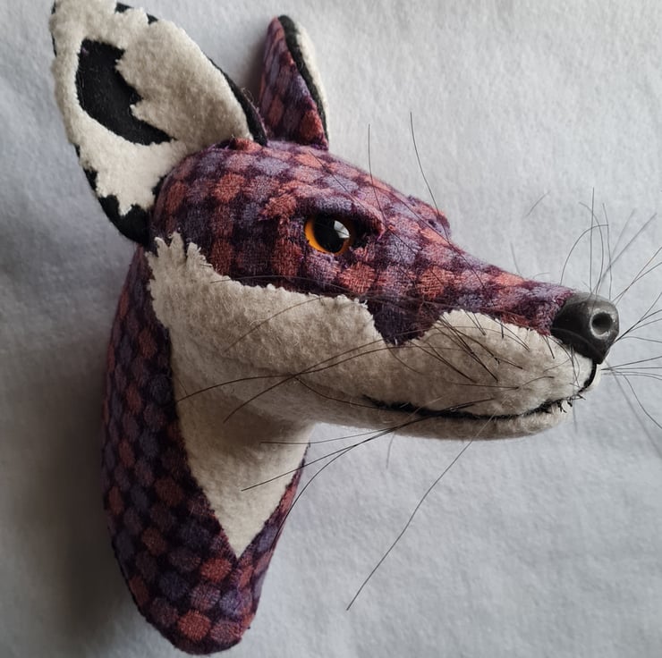 A lifesize faux fox head which I have handmade and covered in hand stitched tweed fabric. The white wool fabric is upcycled from a vintage blanket. The nose is handmade from polymer clay. The head is backed with felt and has a metal hanger to hang it on the wall. It is lightweight.