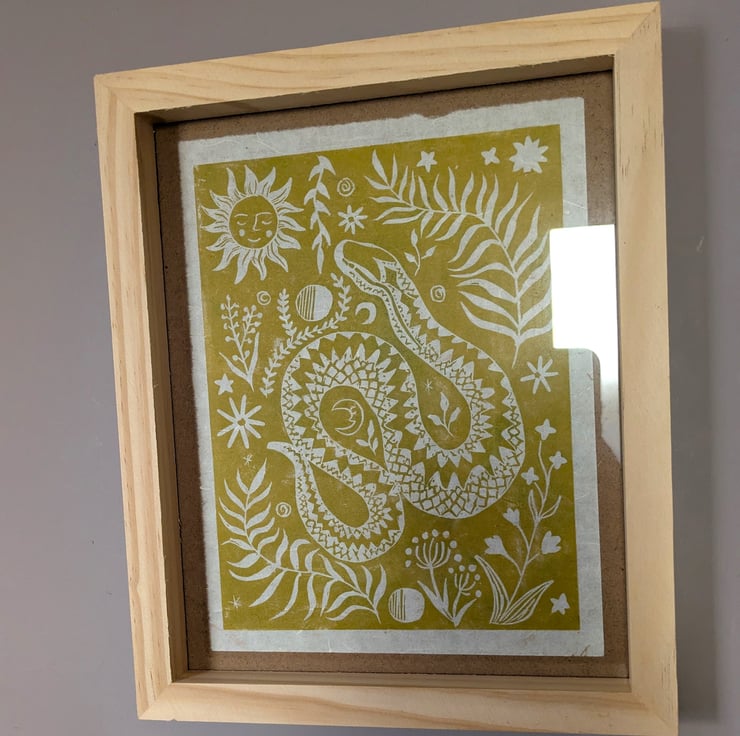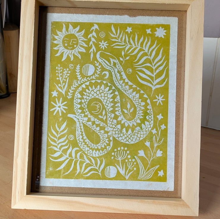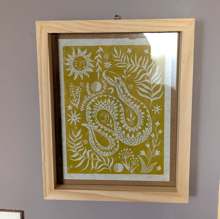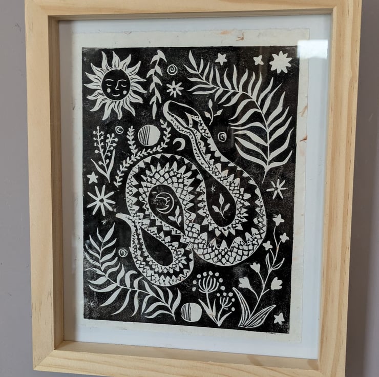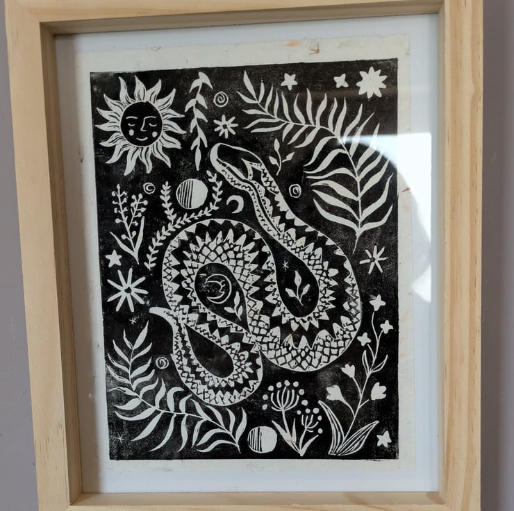 "Adder Folk Print" is created using relief printing with a carved lino block, using Calico Safewash Ink. Each print is handprinted therefore will carry slight variations which add to the unique individuality of every print. These are printed onto lightweight natural handmade mulberry paper with long fibres and dried flowers, making each sheet unique and textured.