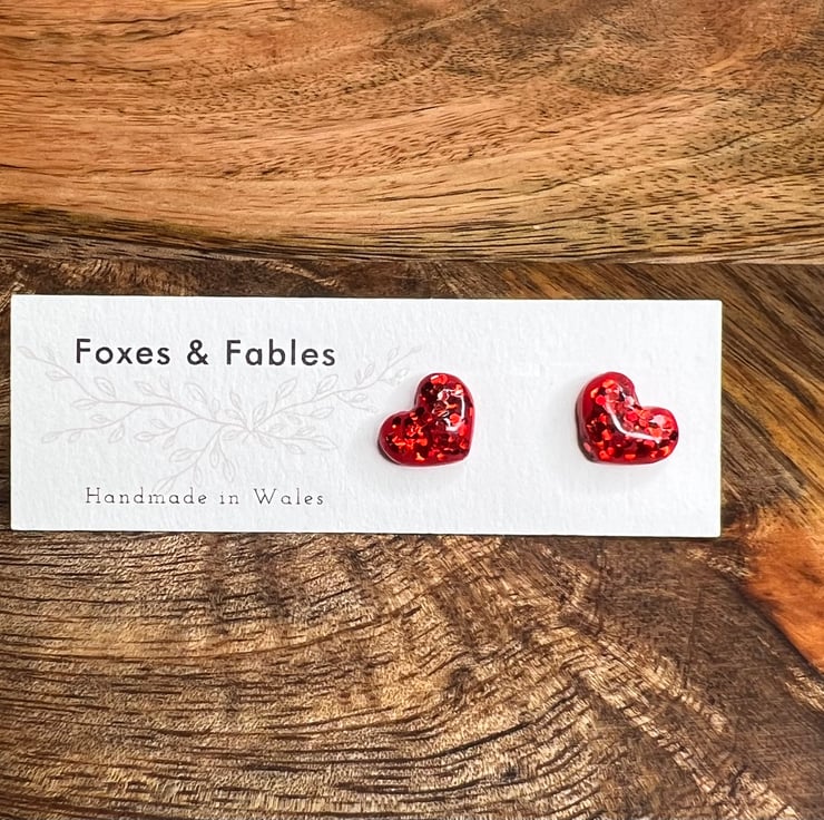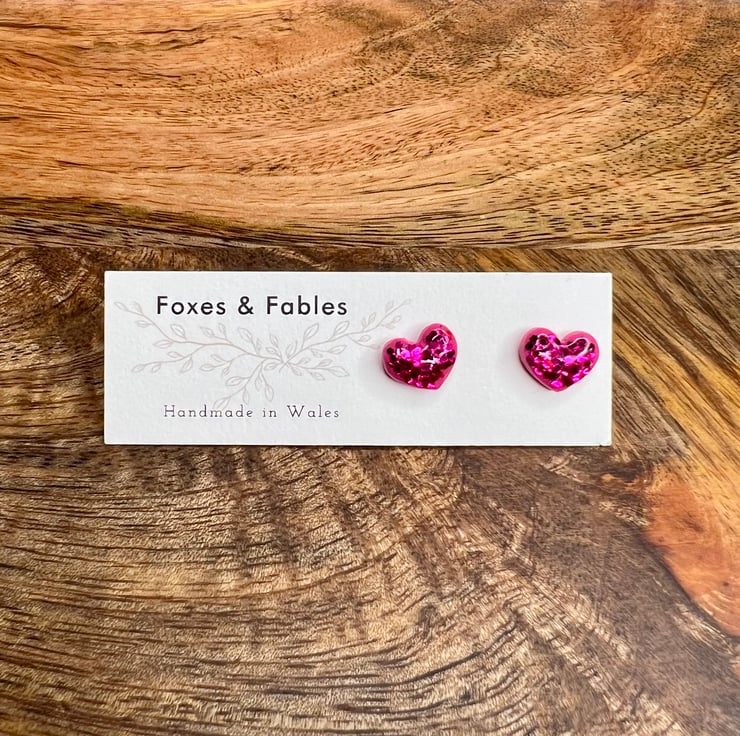 Tiny heart shaped stud earrings in red or hot pink. Handmade out of polymer clay with chunky glitter and finished with resin for a high shine finish.