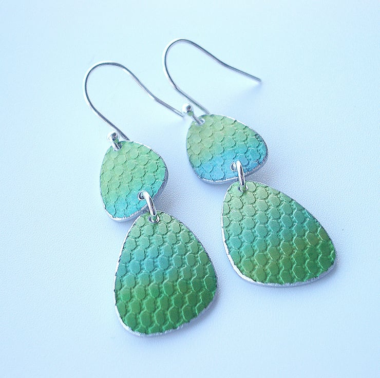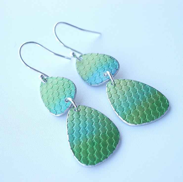These mid century inspired earrings are made from anodised aluminium which I have dyed in green and turquoise using inks and then textured to look a bit like fish scales. I cut the pebble shapes by hand using a jeweller’s saw and file the edges to give a nice smooth finish. Finally I dome the pebble shapes so that they catch the light.