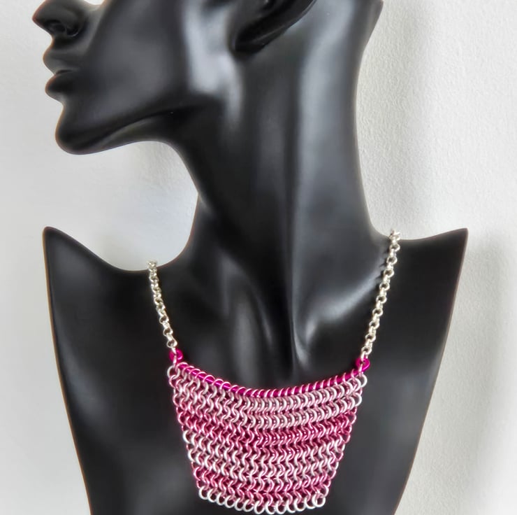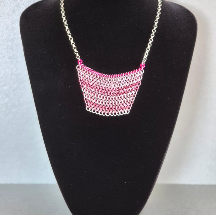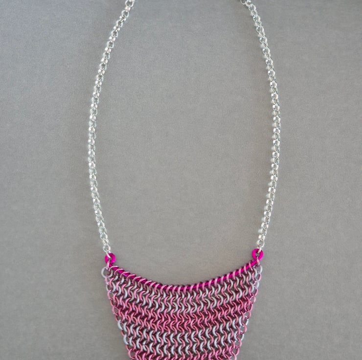 Handcrafted chainmaille necklace using European weave. Necklace is created using various shades of pink jump rings. Would look great sitting under a shirt collar or in a more traditional way. Has silver tone chain and lobster clasp. Total length 46 cm.