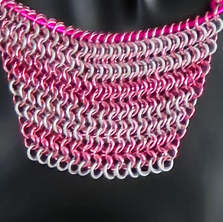 I wanted to create something akin to a man's tie, but with a very feminine feel. The pink of the chainmaille and the masculinity of the chainmaille marries perfectly.