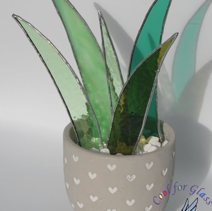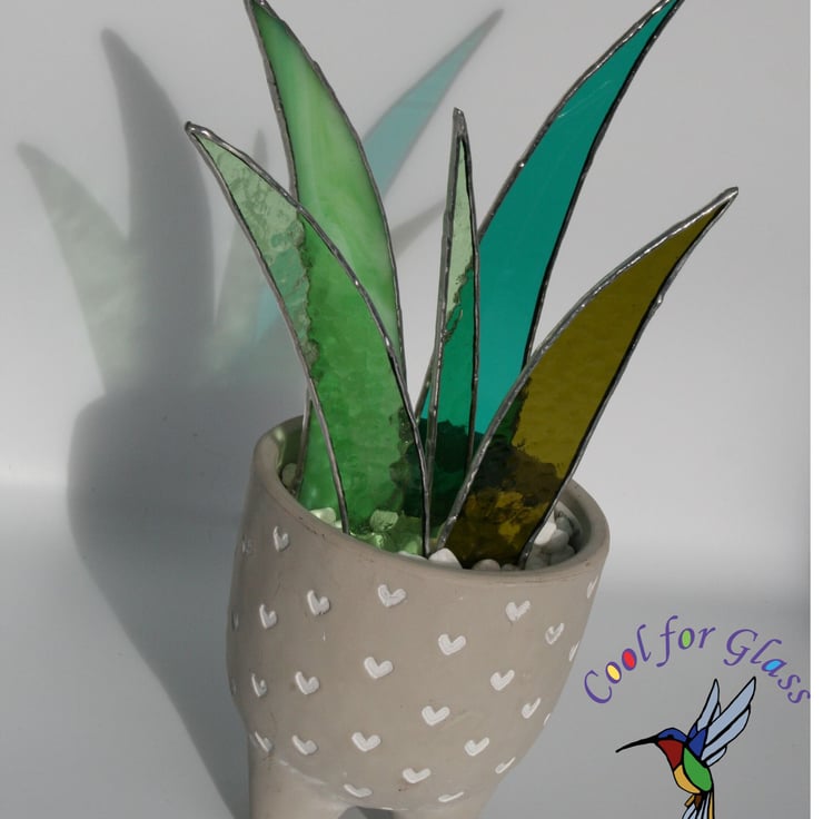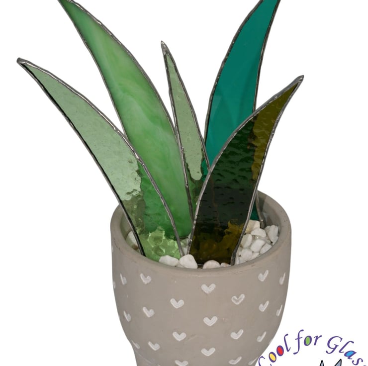 Brighten up your room with this Stained Glass Aloe Vera! This beautiful piece features various different shades of green stained glass leaves arranged in a charming ceramic pot decorated in small hearts. Perfect for adding a touch of elegance and nature to your home or office and it doesn't need to be watered.