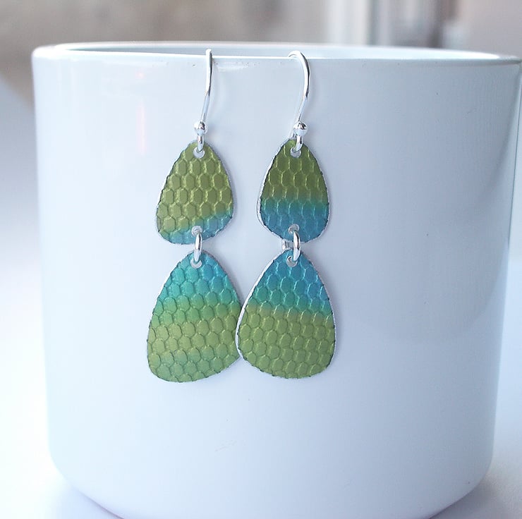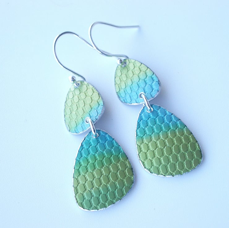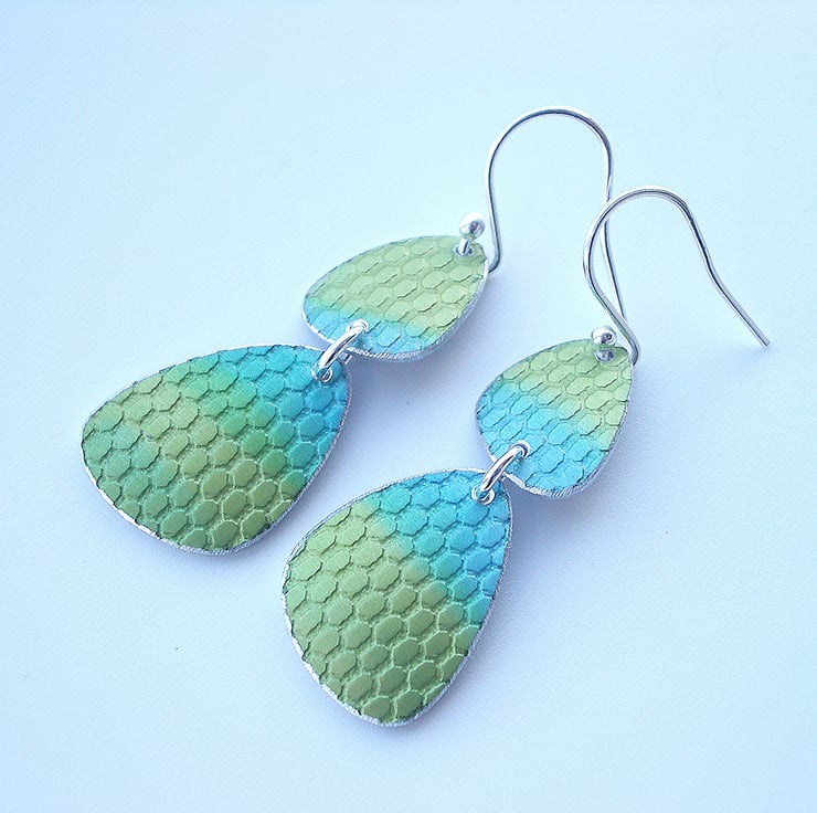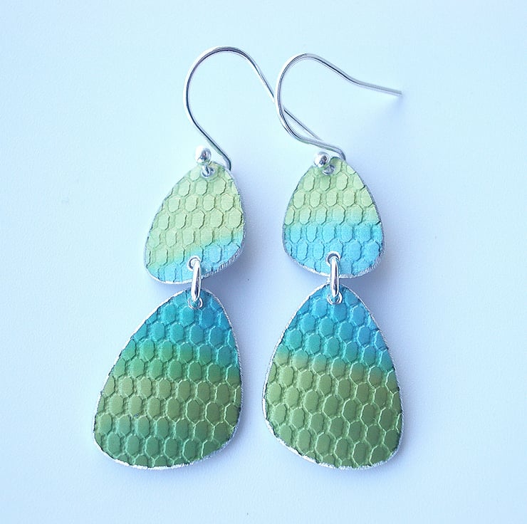 These mid century inspired earrings are made from anodised aluminium which I have dyed in green and turquoise using inks and then textured to look a bit like fish scales. I cut the pebble shapes by hand using a jeweller’s saw and file the edges to give a nice smooth finish. Finally I dome the pebble shapes so that they catch the light.