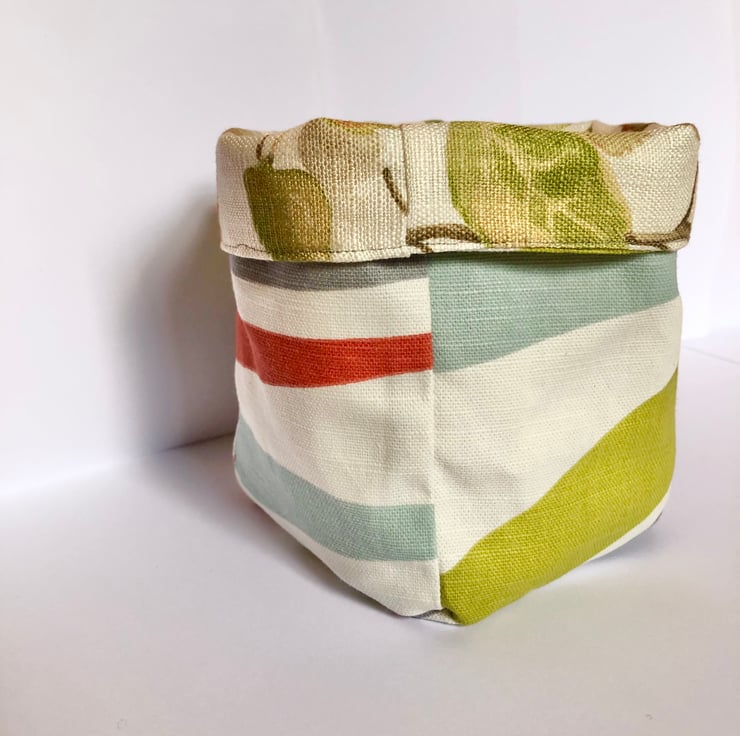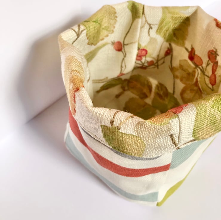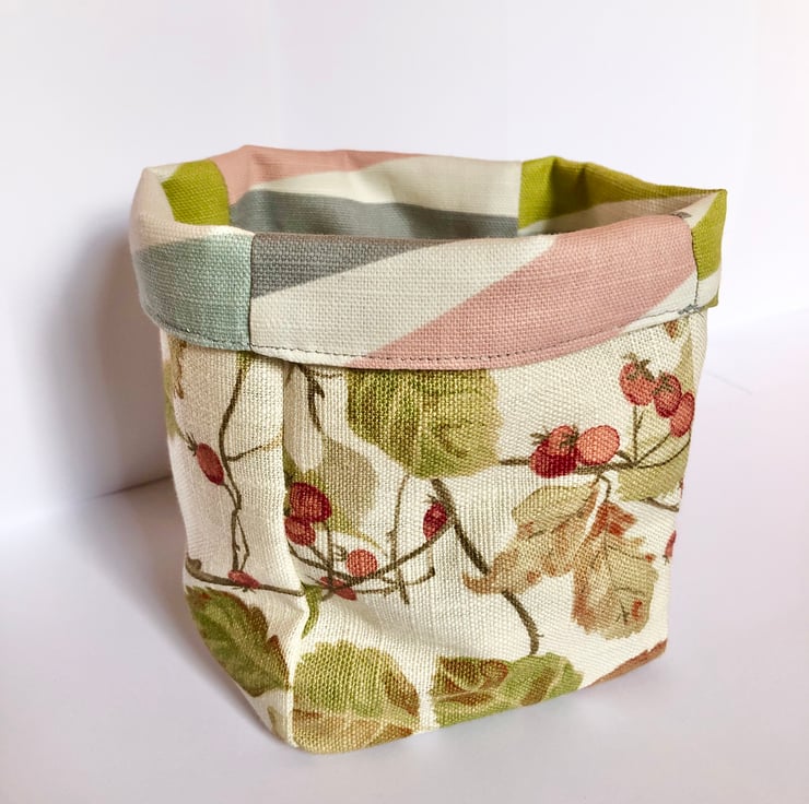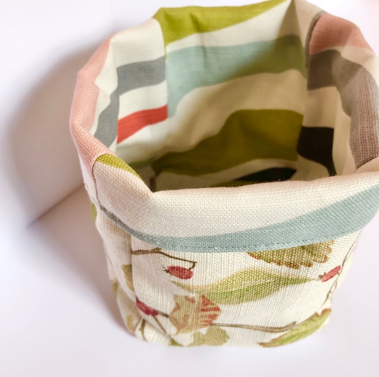 A reversible floral print fabric storage basket with a striped lining. The lovely floral fabric is by Sanderson and the lining is by Scion.