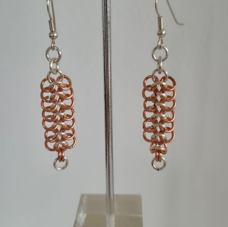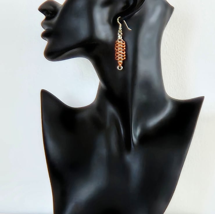 Handcrafted drop, orange and silver drop chainmaille earrings using European Weave. Total drop from ear wire 6cm.