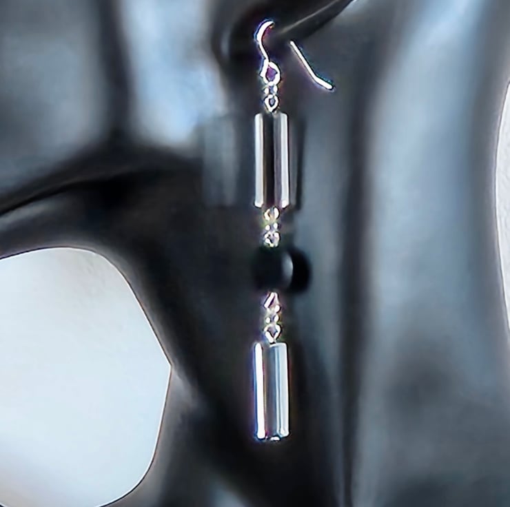 Handcrafted black and clear plastic statement dangle earrings. Sterling silver earring wires. Total drop from top of earring wire 8.5cm.