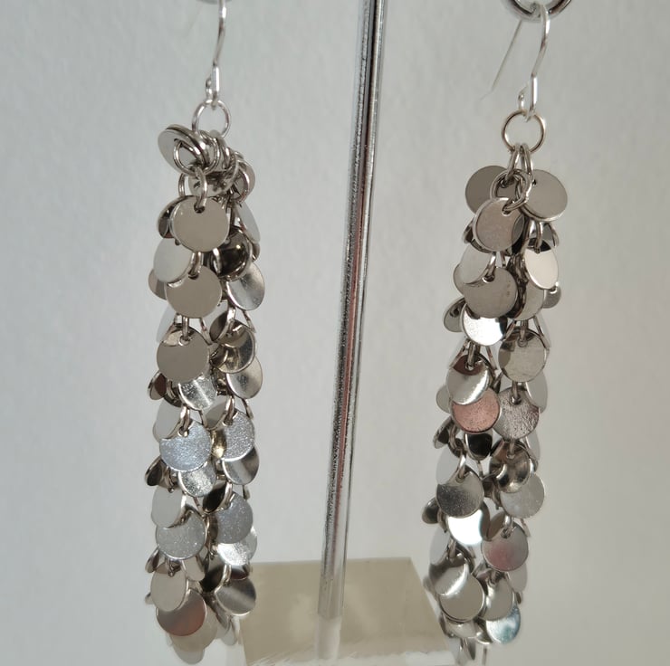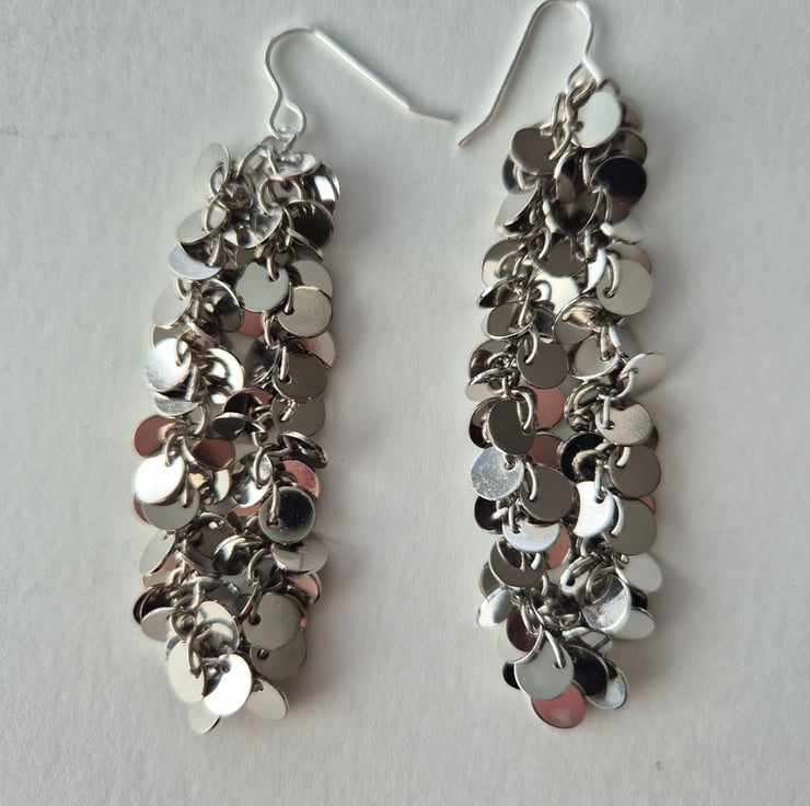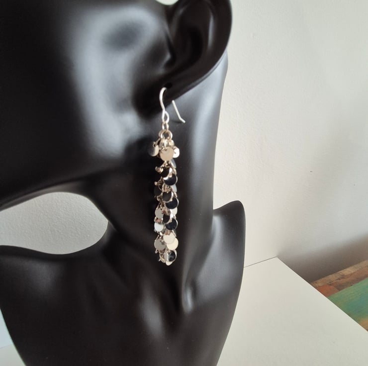 Handcrafted, long sparkly, dangle, disc earrings. Ideal for parties or special occasions. Total length from top of earring wire 8cm. Earring wire is sterling silver.