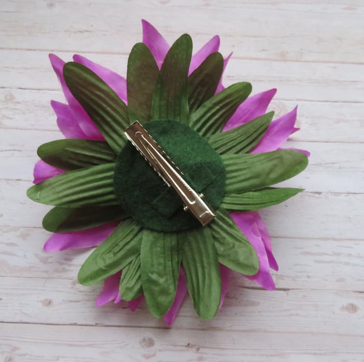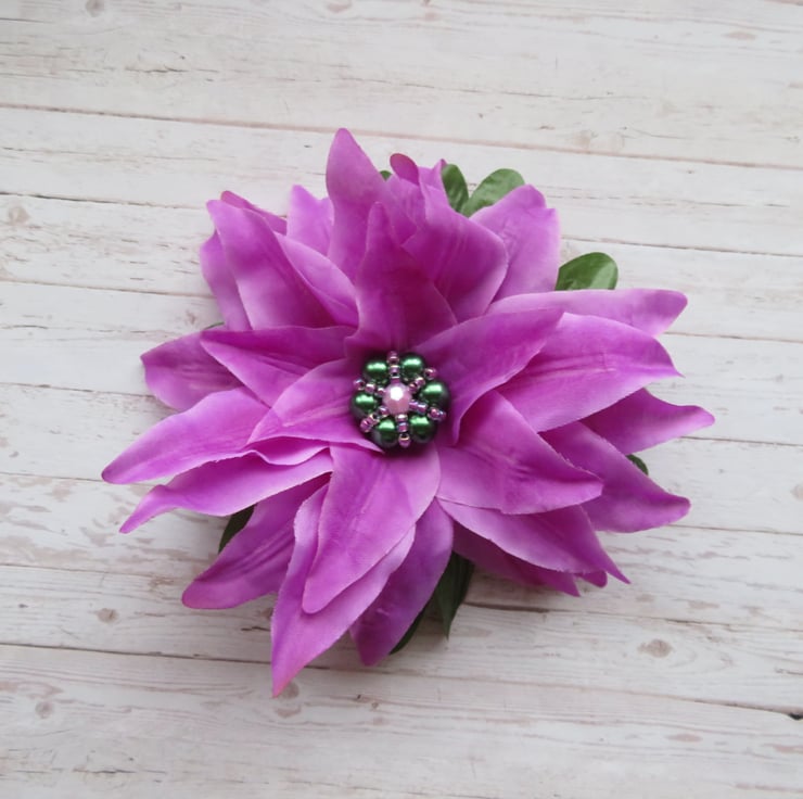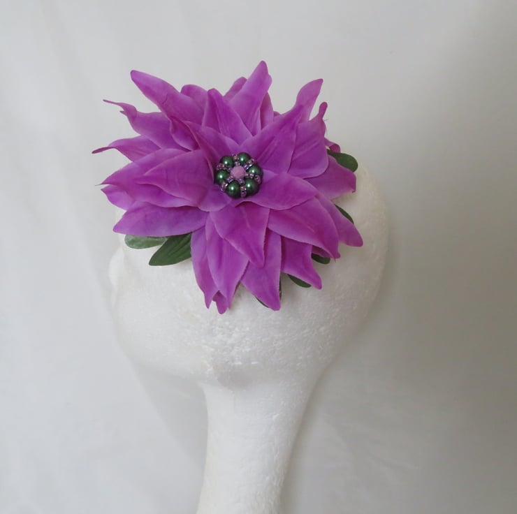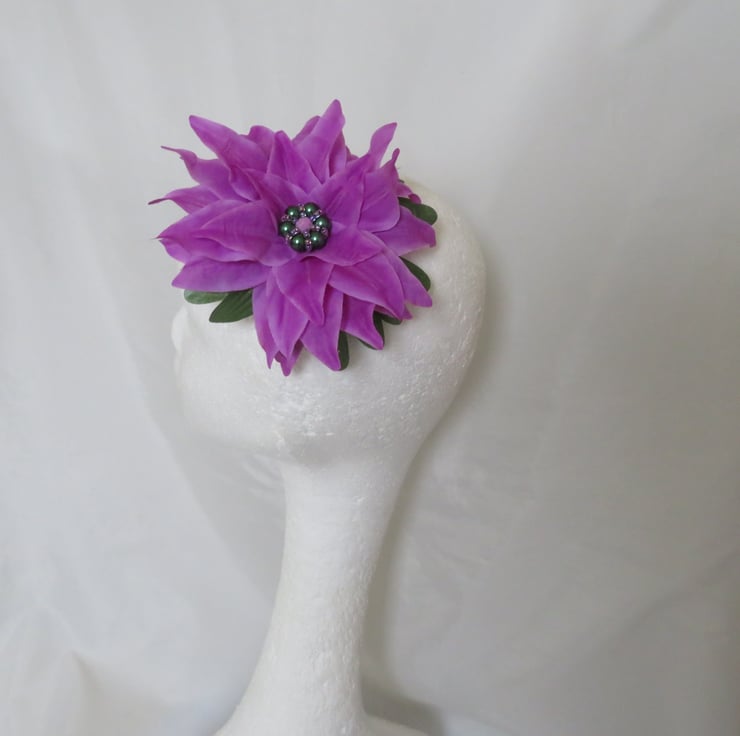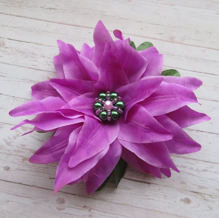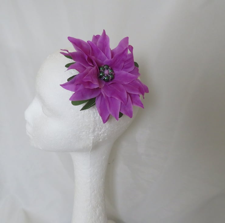 This is a large and pretty hair flower accessory in deep lavender/ radiant orchid and dark green.