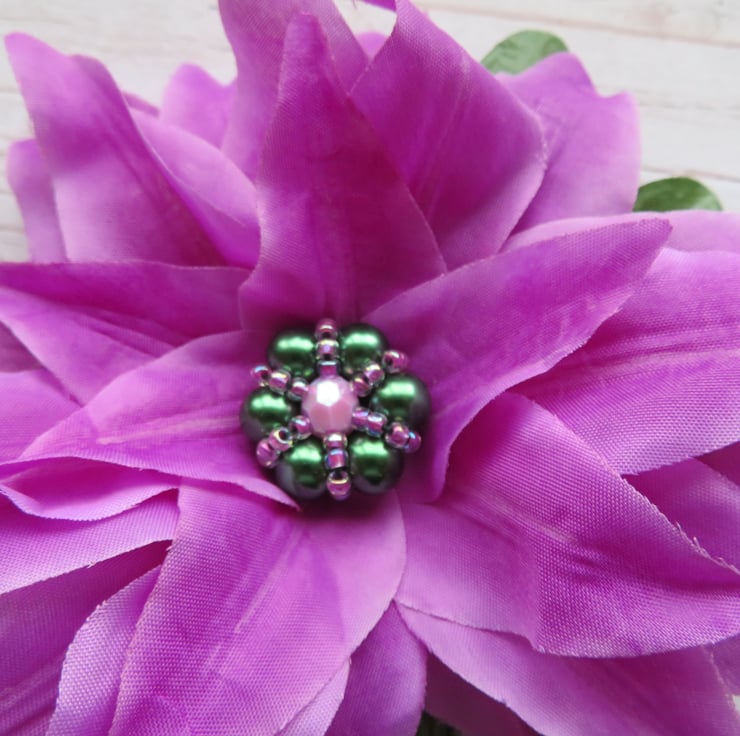 Finished with a beaded cluster of dark green pearls, lavender crystal and lavender bugle beads.