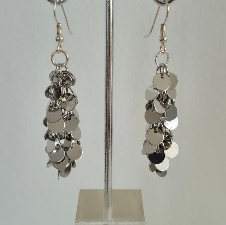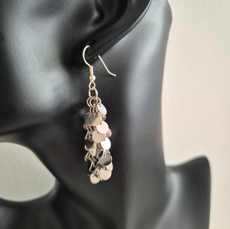 Handcrafted, dangle, sparkly disc earrings. Ideal for parties or special occasions. Total drop from top of earring wire 6cm.