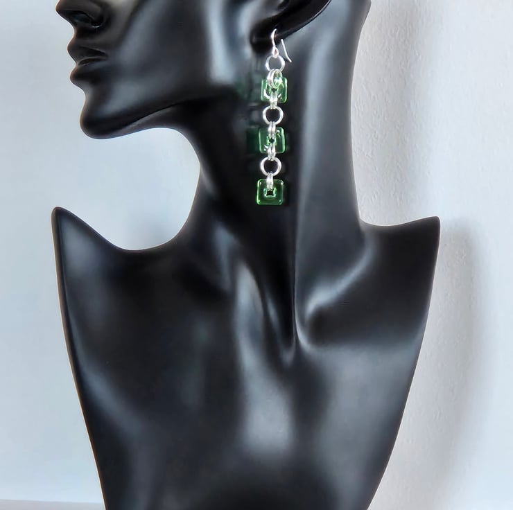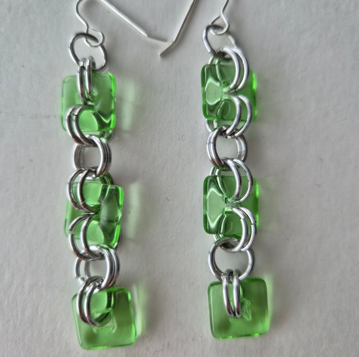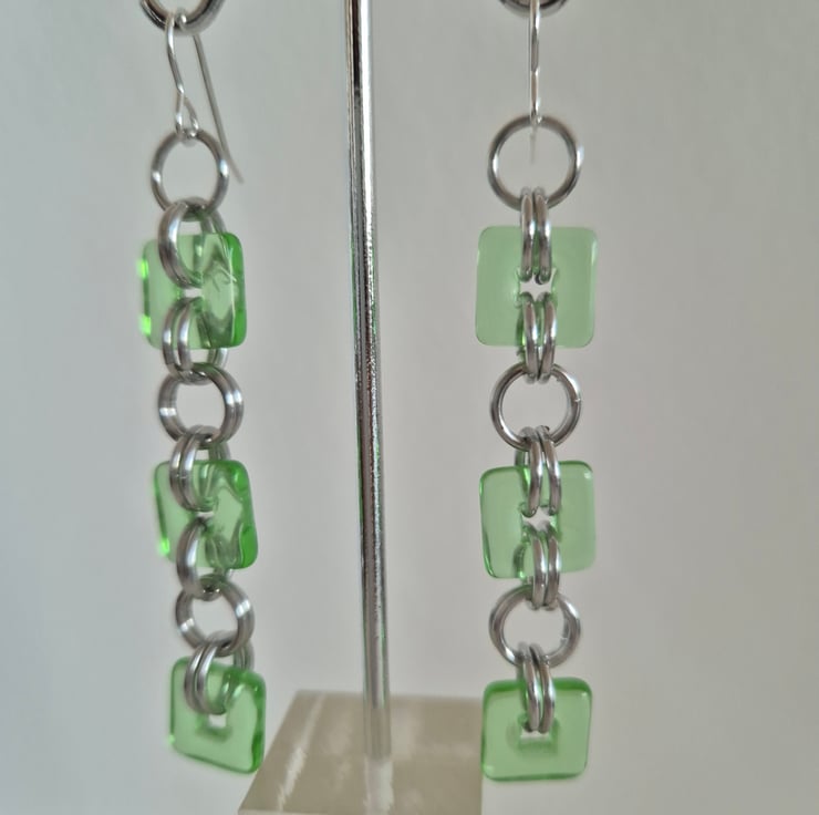 Handcrafted, modern dangle earrings with green acrylic squares. Green design is a one-off. Total length from top of earring wire 8cm. Earring wires are sterling silver