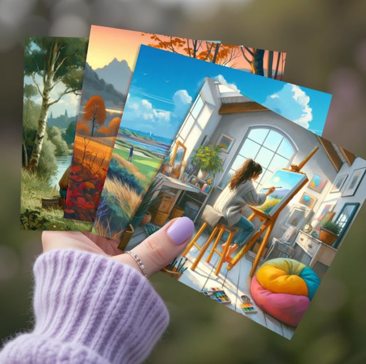 A collection of four 148mm square cards depicting people at play. Each card has been professionally printed on FSC registered cardstock. Cards come with complementary kraft envelopes.
