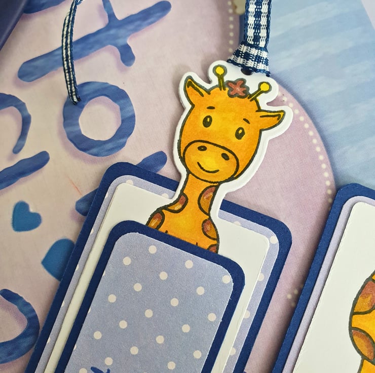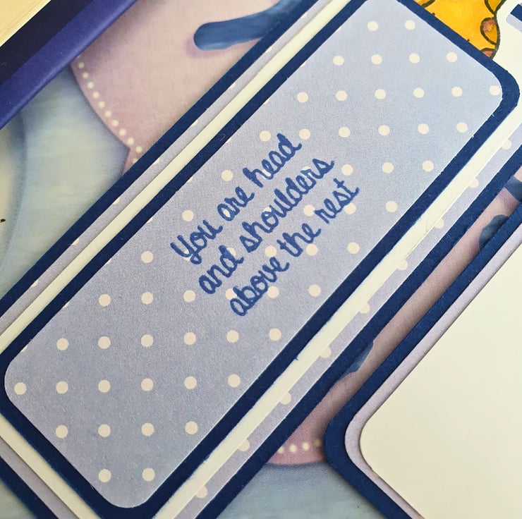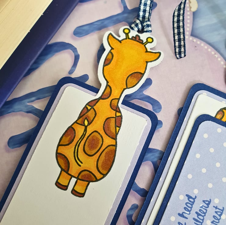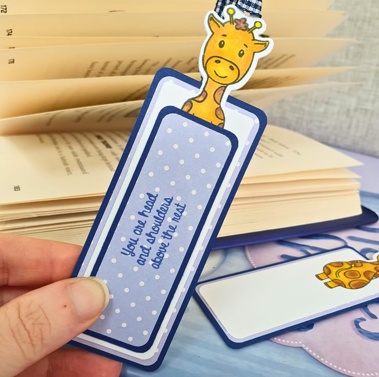 Both the front & the back of the giraffe figure are stamped on a white smooth card & hand coloured with alcohol markers. The two parts come together with a panel of dark blue cardstock layered with light purple thick paper with white polka dots on either side, to provide a very sturdy bookmark that will stay nice and firm. On the front, a smaller set of the same layered panel is stamped with the sentiment "You Are Head And Shoulders Above The Rest", while the back has been left white.