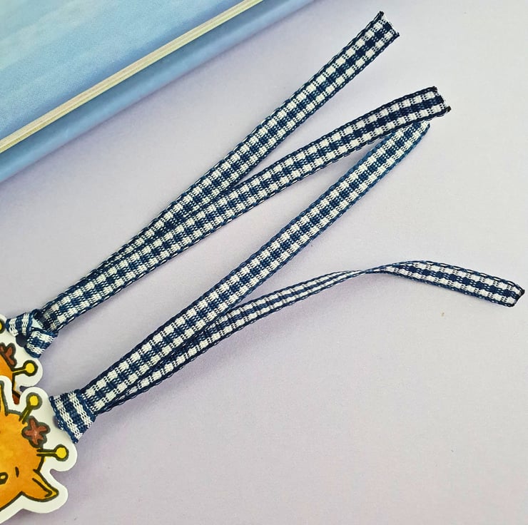 The bookmark measures 13.5cm x 4.2cm and comes with a blue & white gingham ribbon already attached (9cm long, 5mm wide).