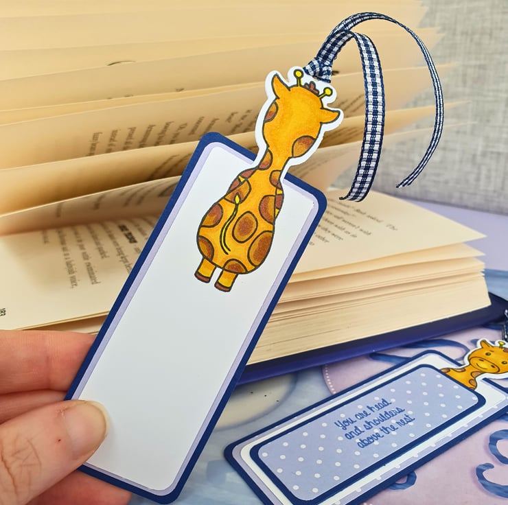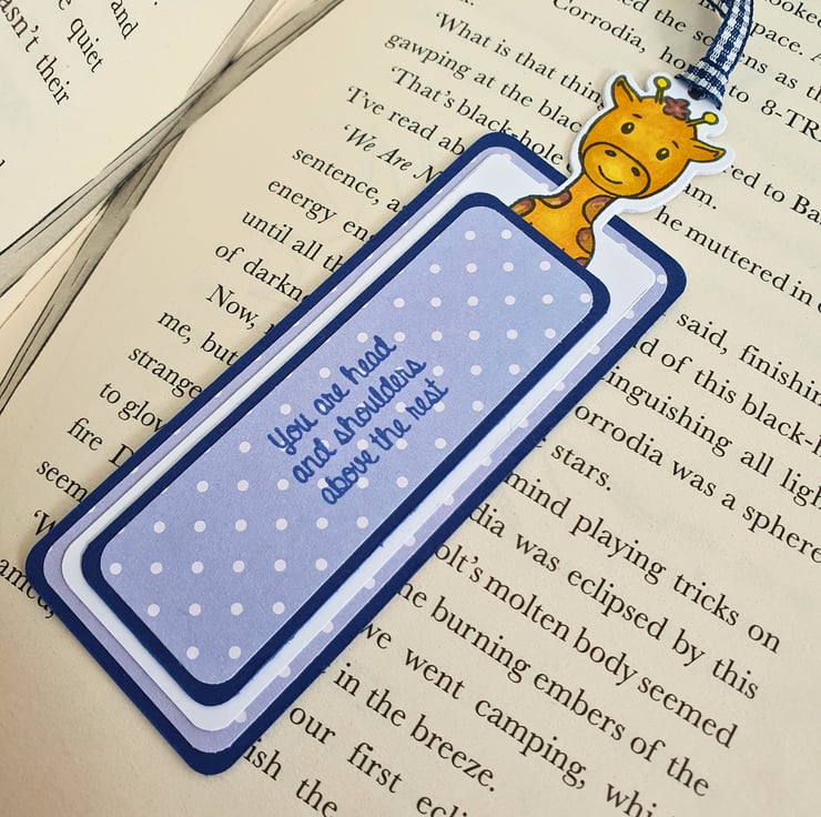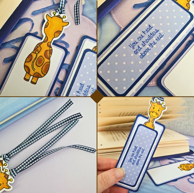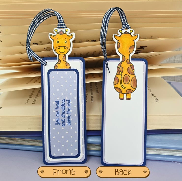 Both the front & the back of the giraffe figure are stamped on a white smooth card & hand coloured with alcohol markers. The two parts come together with a panel of dark blue cardstock layered with light purple thick paper with white polka dots on either side, to provide a very sturdy bookmark that will stay nice and firm. On the front, a smaller set of the same layered panel is stamped with the sentiment "You Are Head And Shoulders Above The Rest", while the back has been left white.