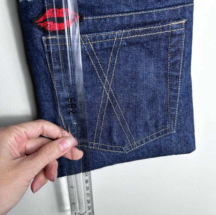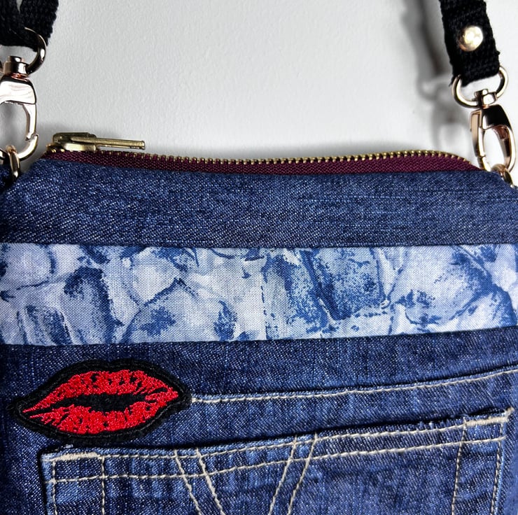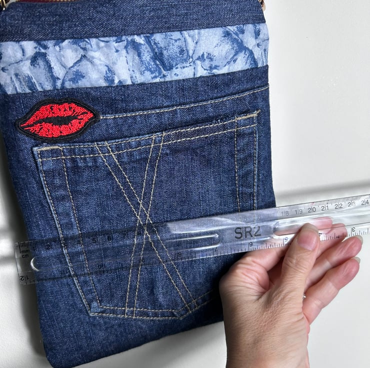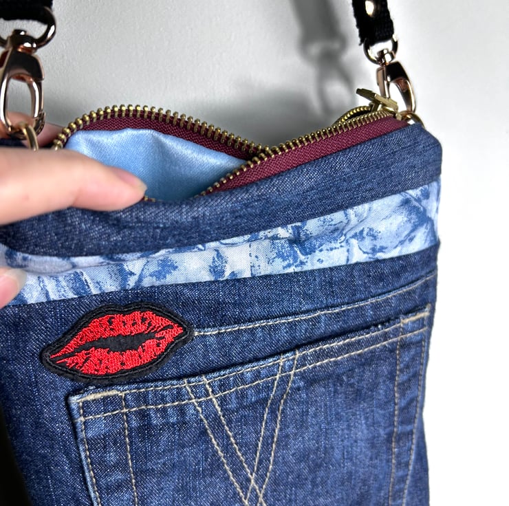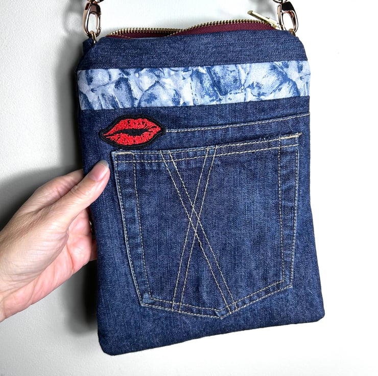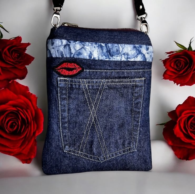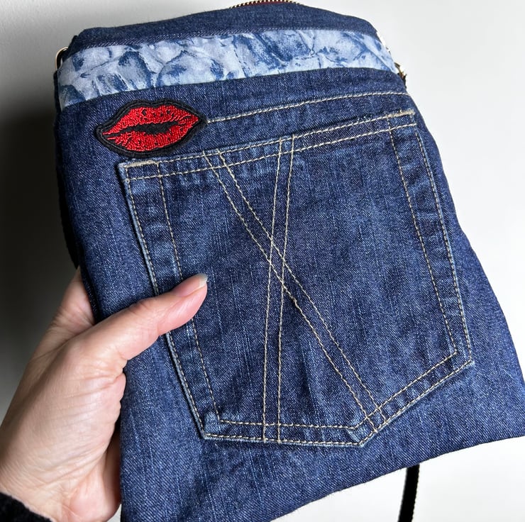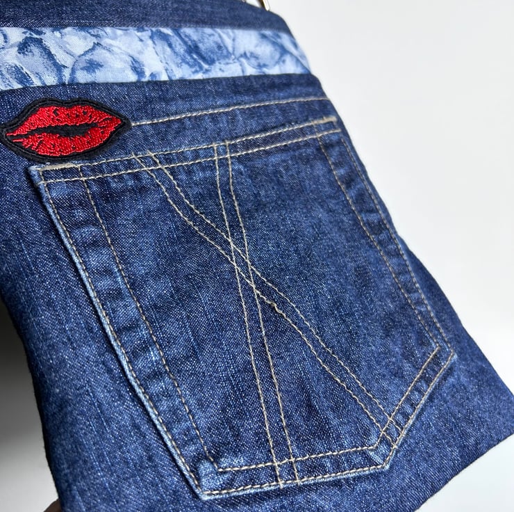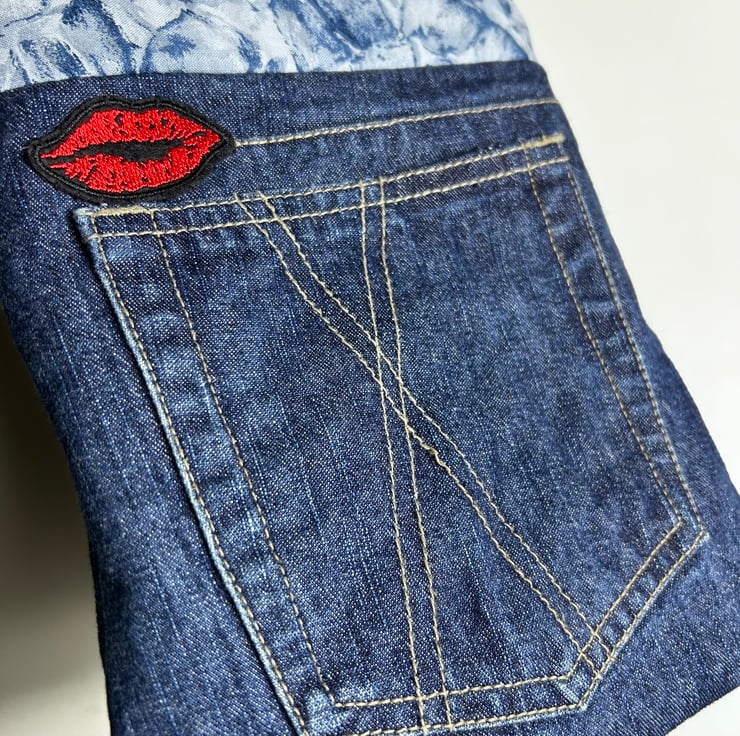 The bag has been made from upcycled jeans which had a cross within the design so a lips patch was added to complete the theme of love and kisses.