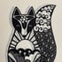 A black and white folk art fox, decorated with plants and moonlight, watches over a home and garden while the residents sleep.