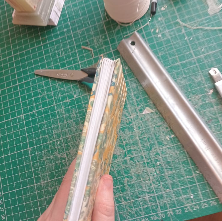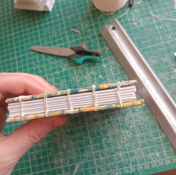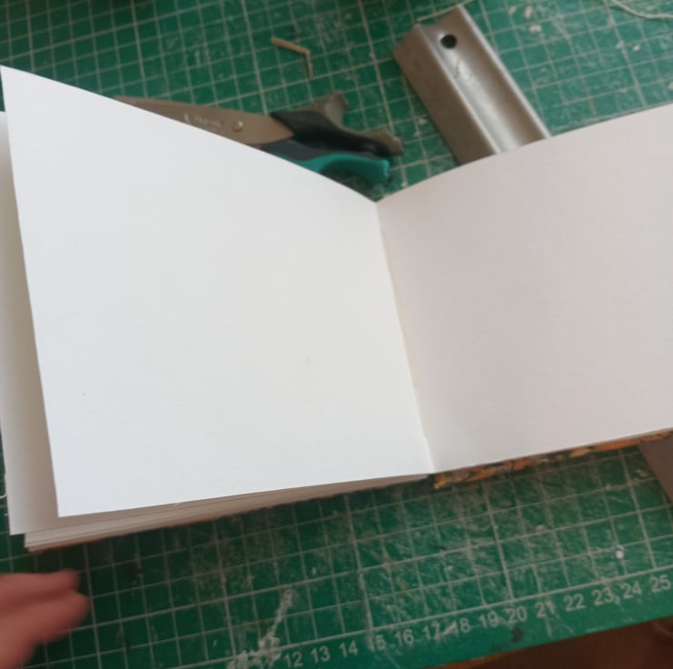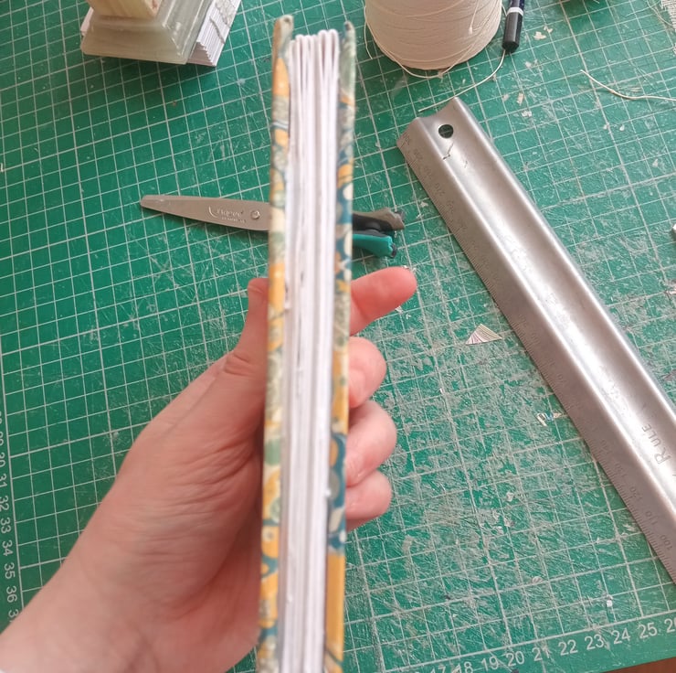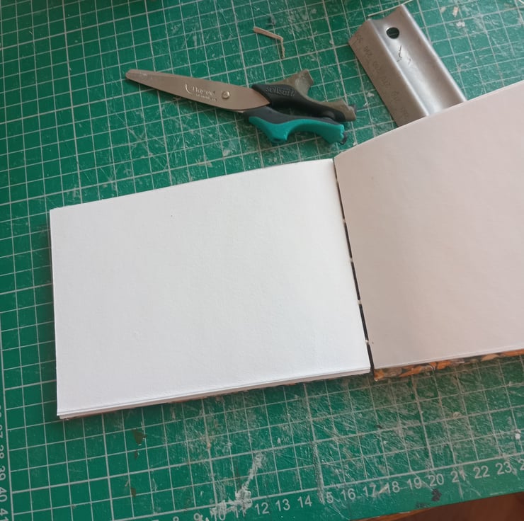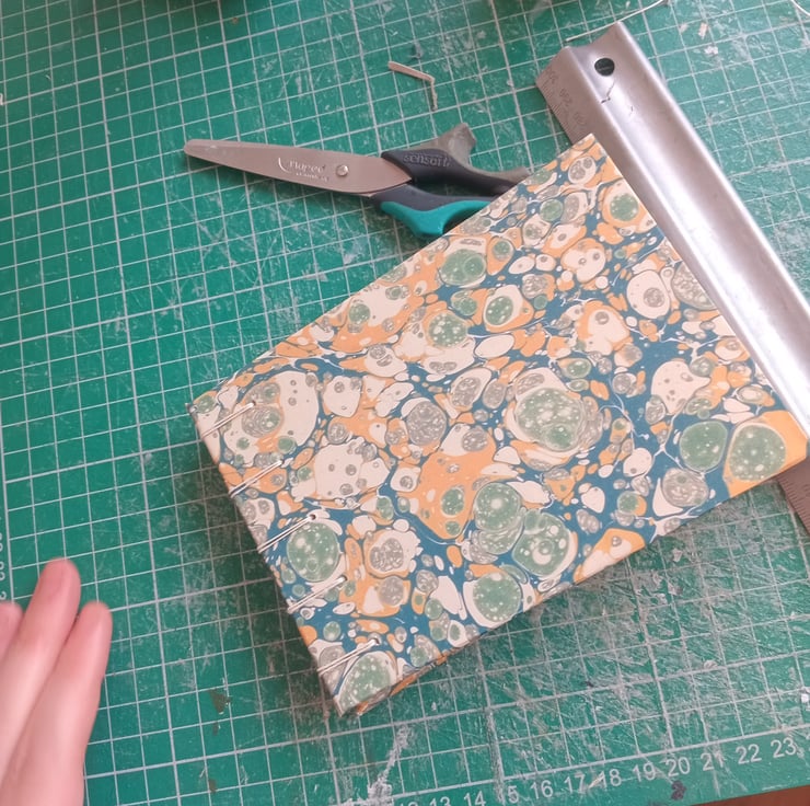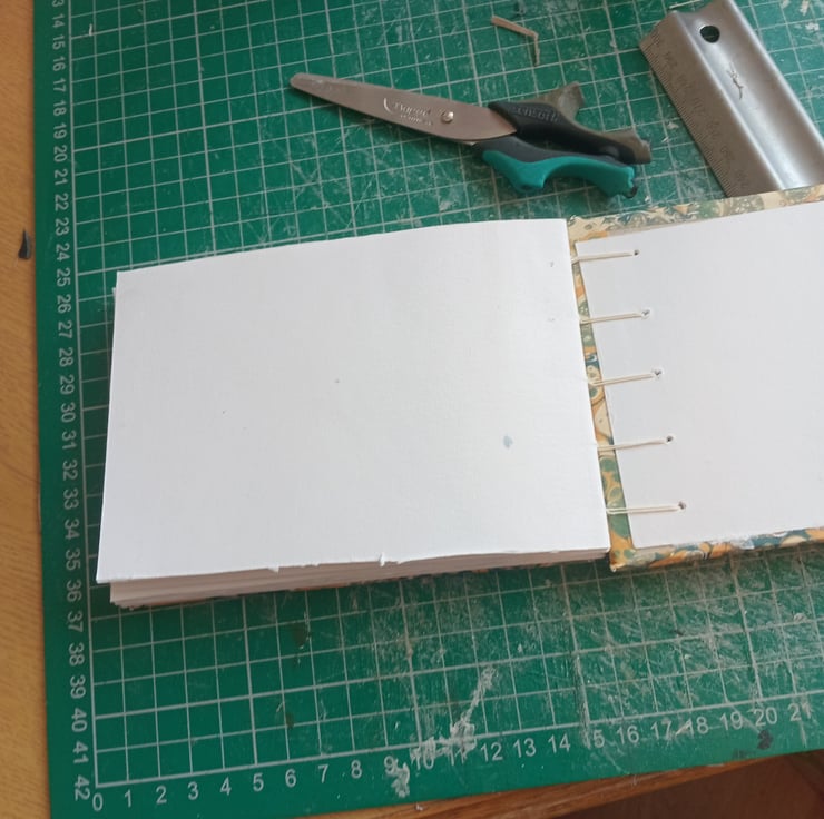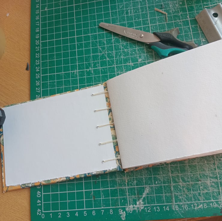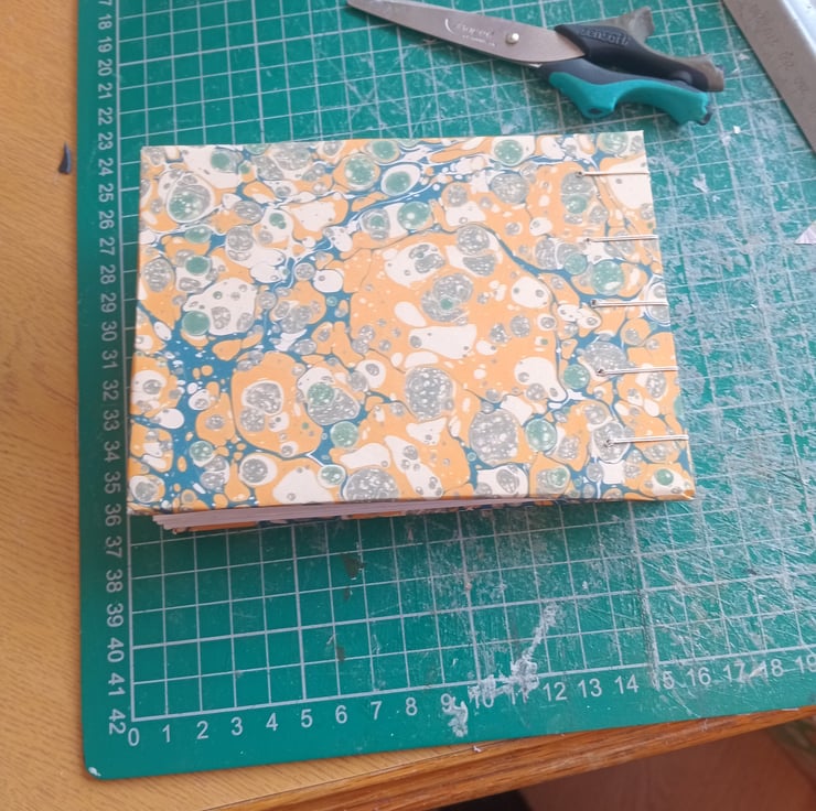 A6 coptic sketchbook with tree free cotton rag watercolour paper and printed marbled design hardcover. 24 leaves, 48 pages/sides. Last photo is of paper source.