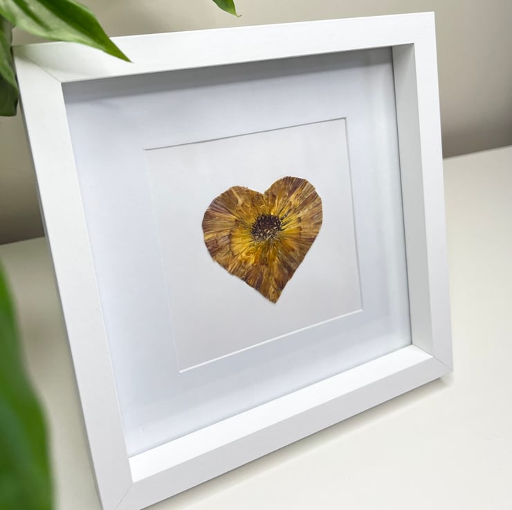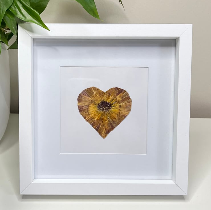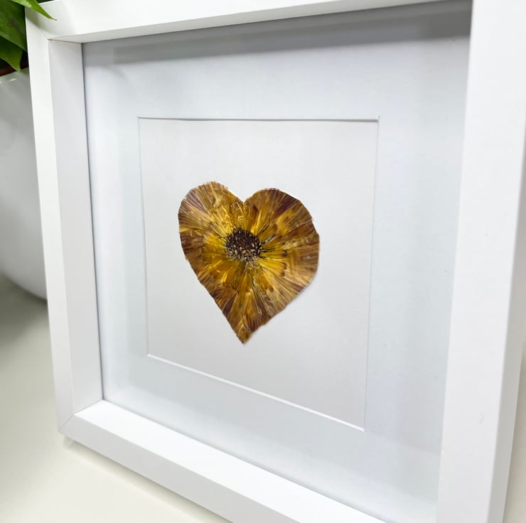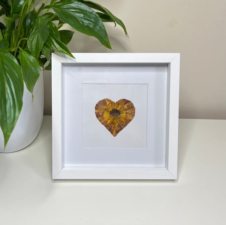 This piece is full of love with this handmade heart of calendula flowers. These flowers were grown from seed in our garden in Hampshire and traditionally slow pressed.