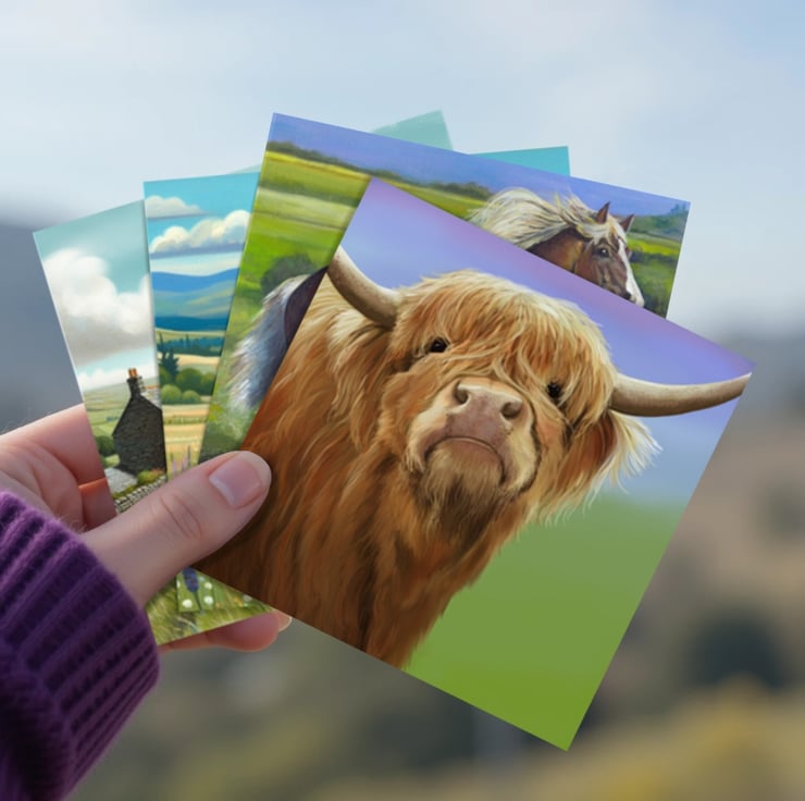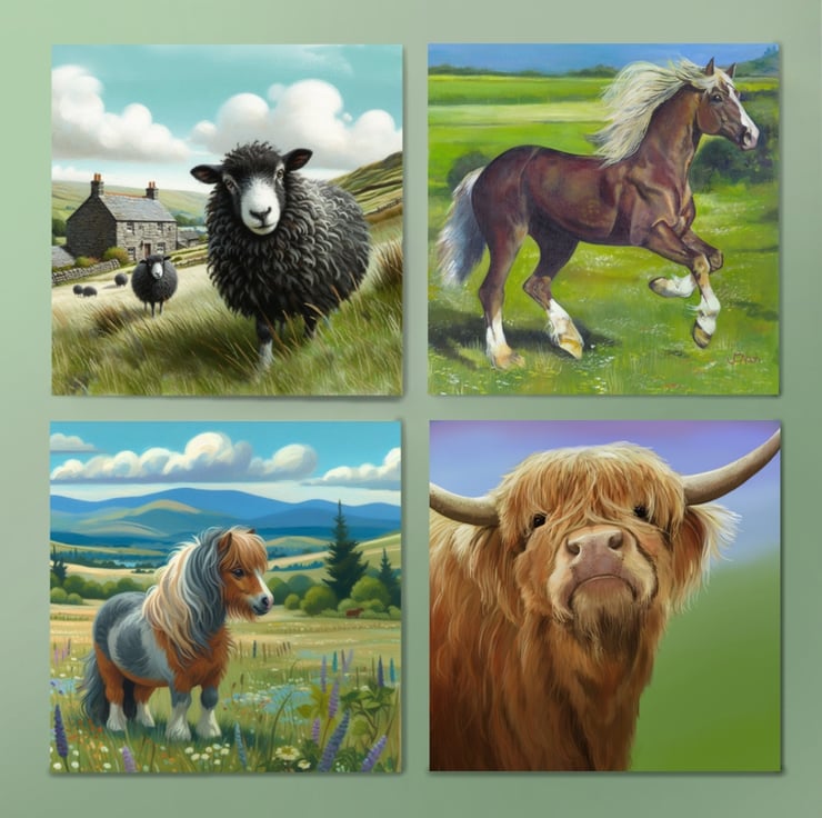 A collection of four 148mm square cards of domestic farm animals. Perfect for horse and cuddly farm animal loving friends and family. Each card has been professionally printed on FSC registered cardstock. Cards come with complementary brown kraft envelopes.