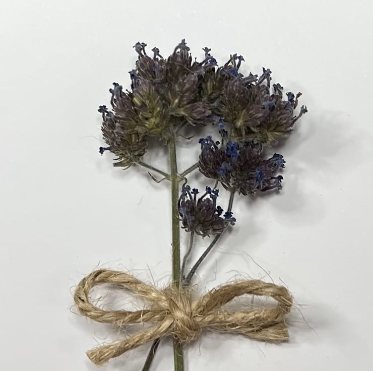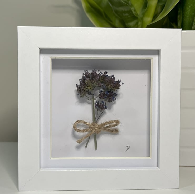 Bring nature indoors with this delicate dried verbena bonariensis grown in our garden in Hampshire. Placed on recycled card and displayed in a white shadow frame.