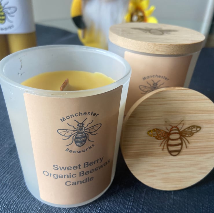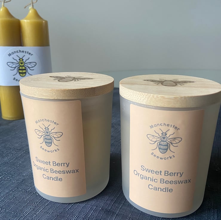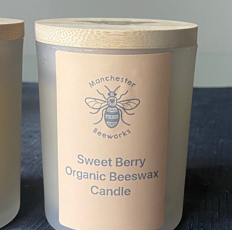 Delightful Frosted Jar containing a hand poured beeswax candle with a wooden wick, delicately scented with a Sweet Berry fragrance this is sure to be a hit.