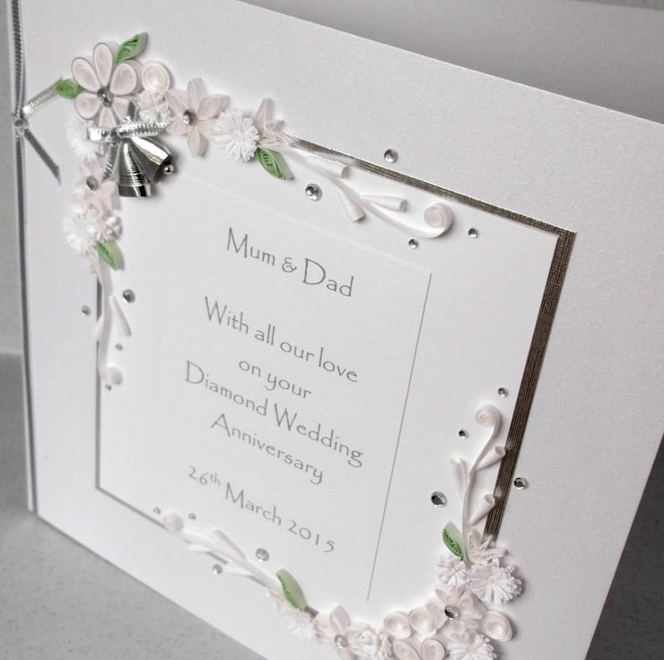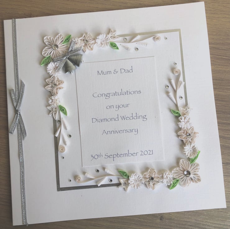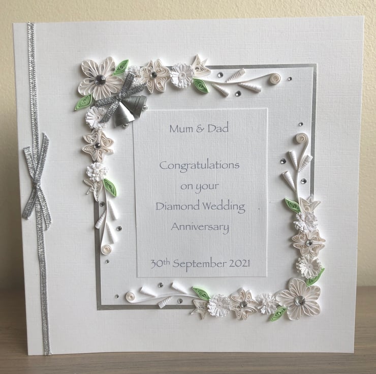 A beautiful, distinctive and unusual quilled diamond 60th wedding anniversary card – you will not find anything like this in the shops. This card measures 8 ins x 8 ins. Featuring a panel printed with your personalised message, bordered with assorted quilled flowers, foliage and silver bells. A scattering of gems ("diamonds"!!) complete the design.