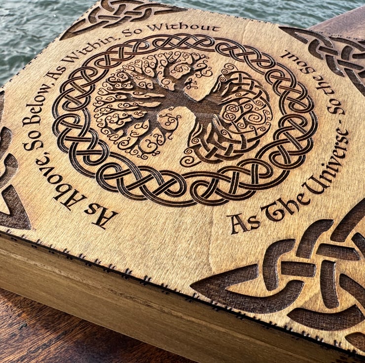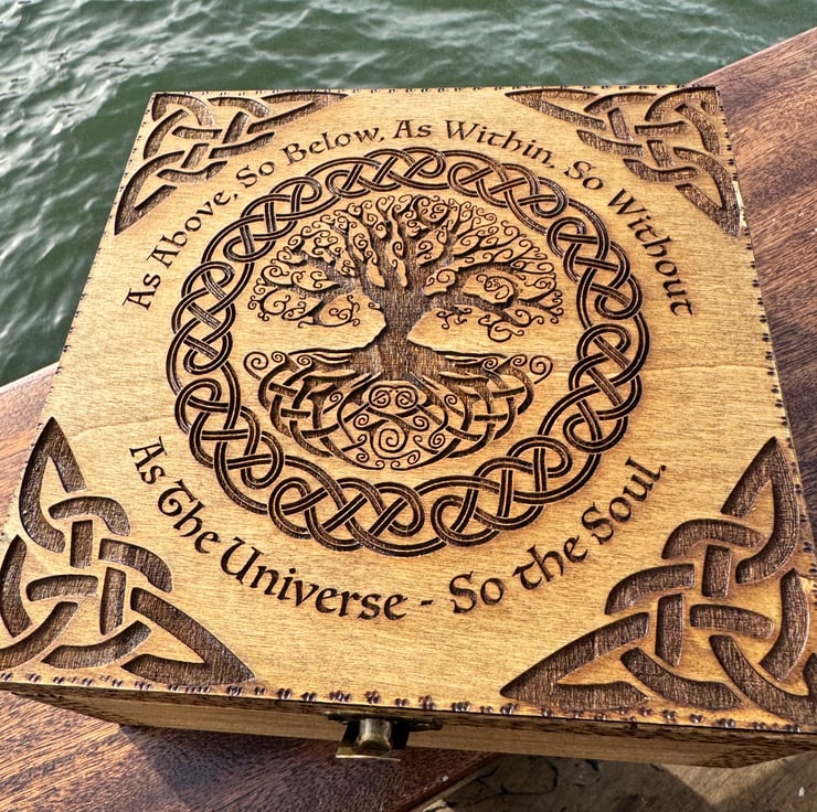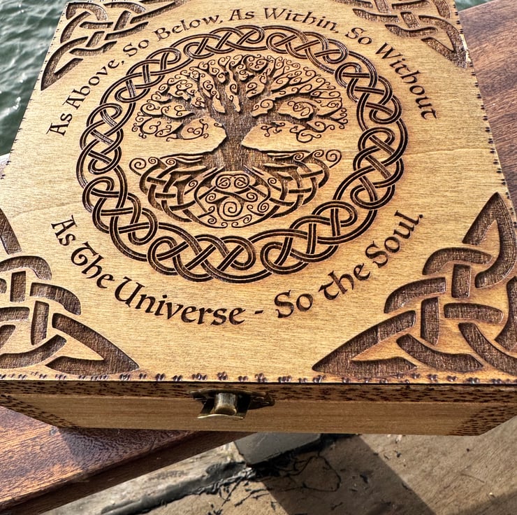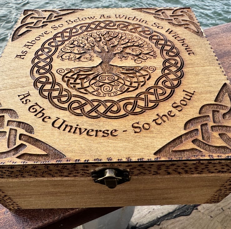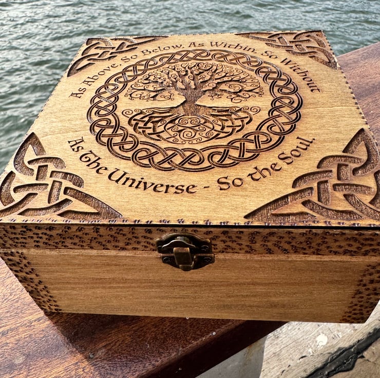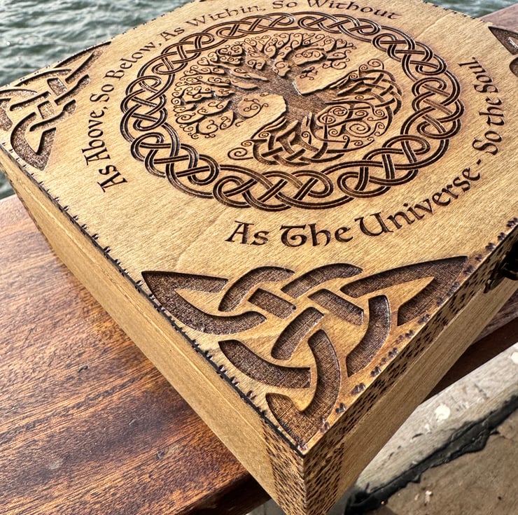 The box is engraved with the tree of life. It’s finished with pyrography. It has a quote around the tree and engraved Celtic knots in each edge of the lid.