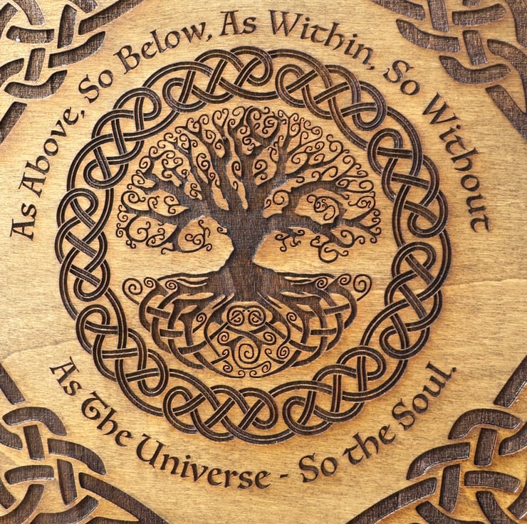 Tree of life, engraved square wooden box, with Celtic knot and spiritual quote.