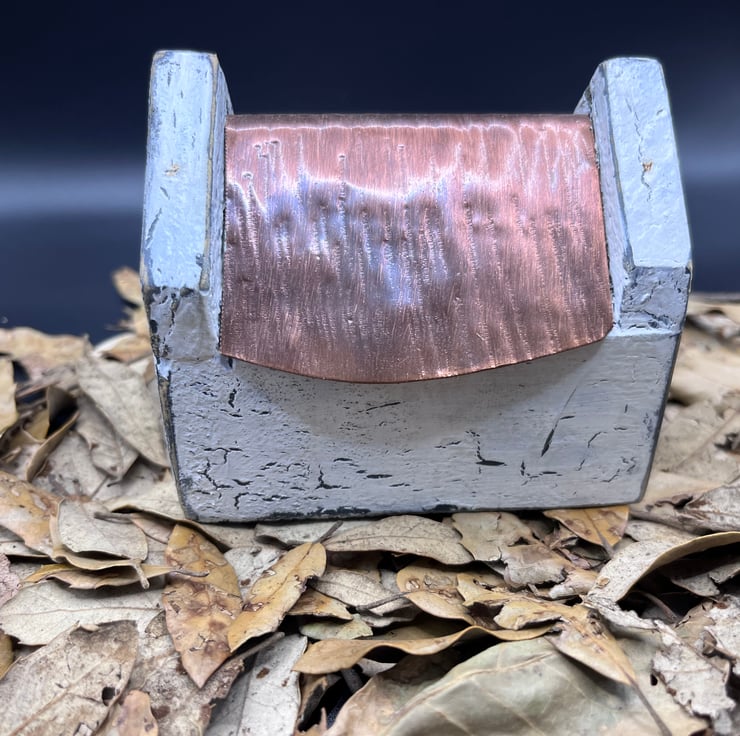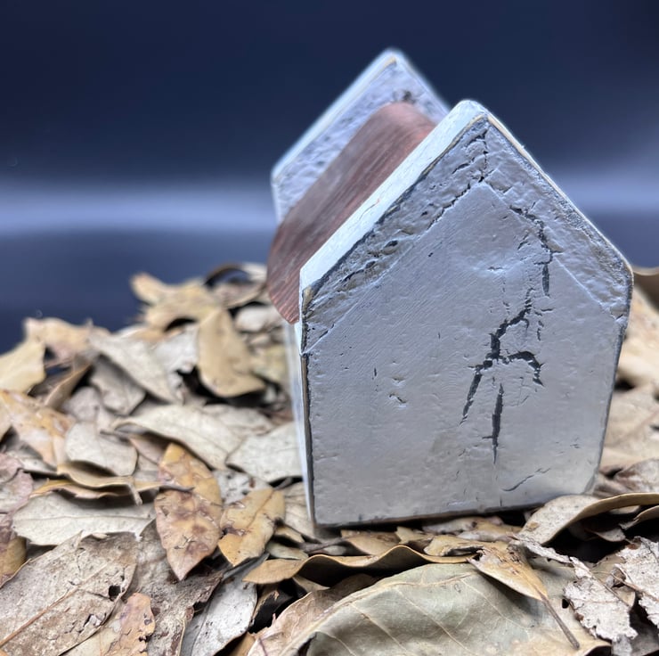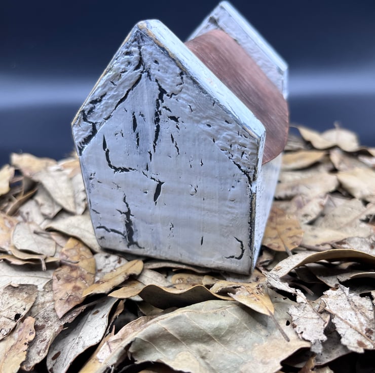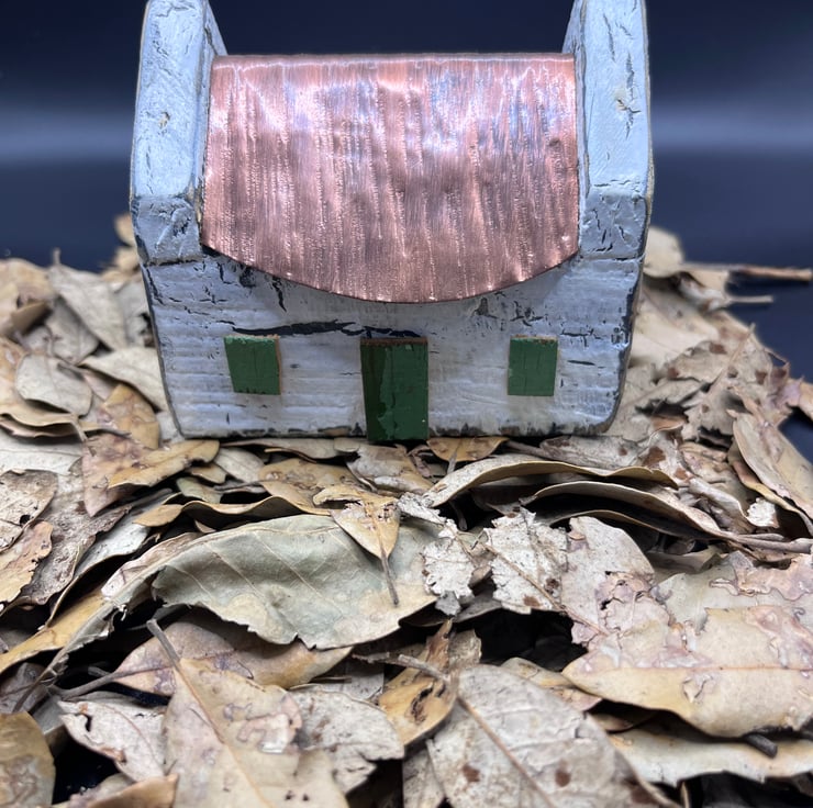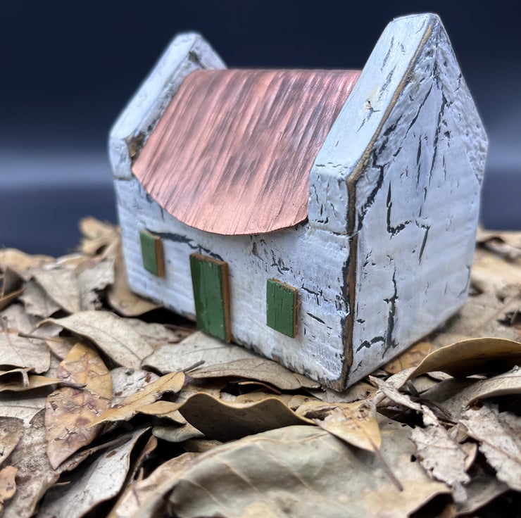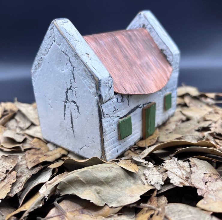 Wooden miniature house with copper roof and painted white in a shabby chic old effect…door and windows are green and add to its charm…95mm wide x 65mm wide & 80mm high ….please note this is not a toy…JK24.