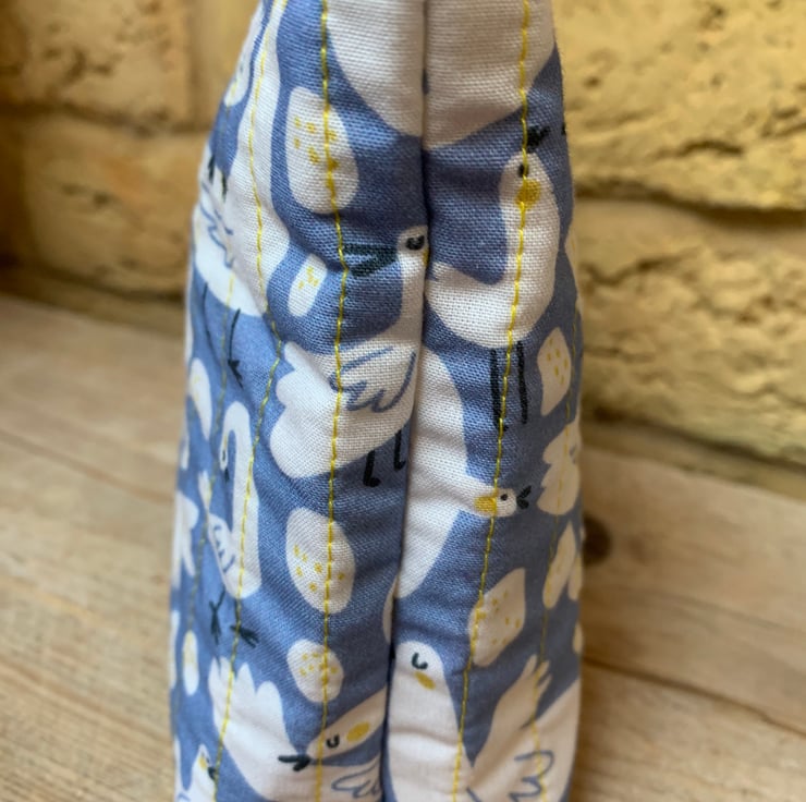 The quilted makeup bag is made from this lovely bird print cotton fabric. Are they gulls? Are they chickens? Lots of opinions but they are fun!