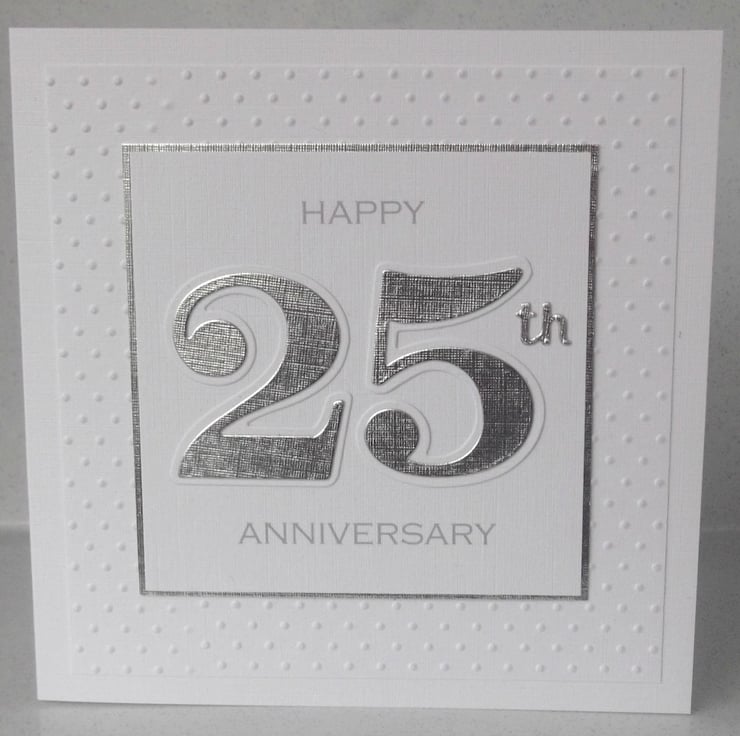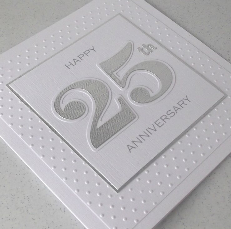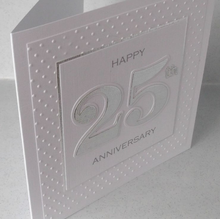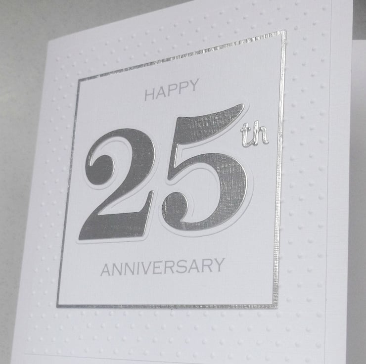 Measuring 5.5 ins x 5.5 ins", this silver wedding card features a greeting reading "Happy 25th Anniversary".