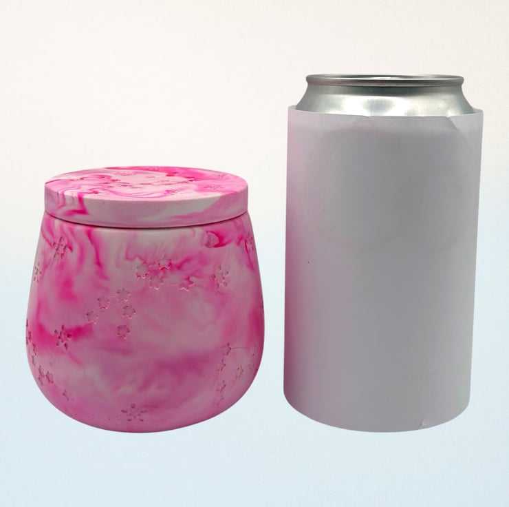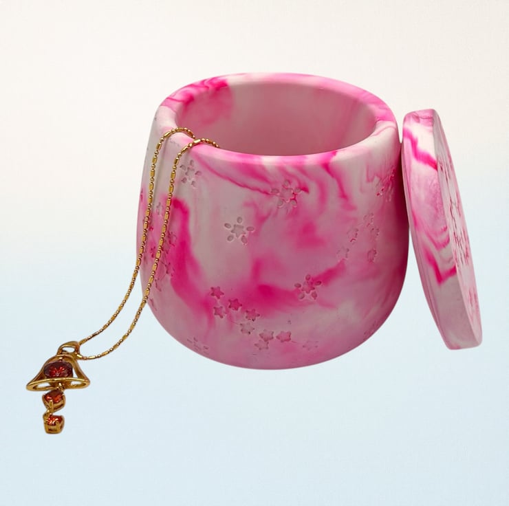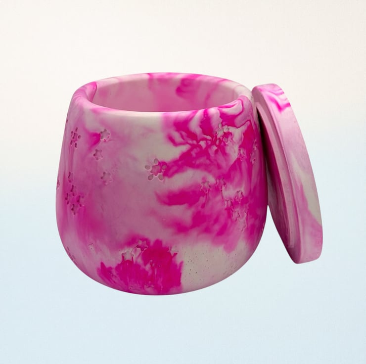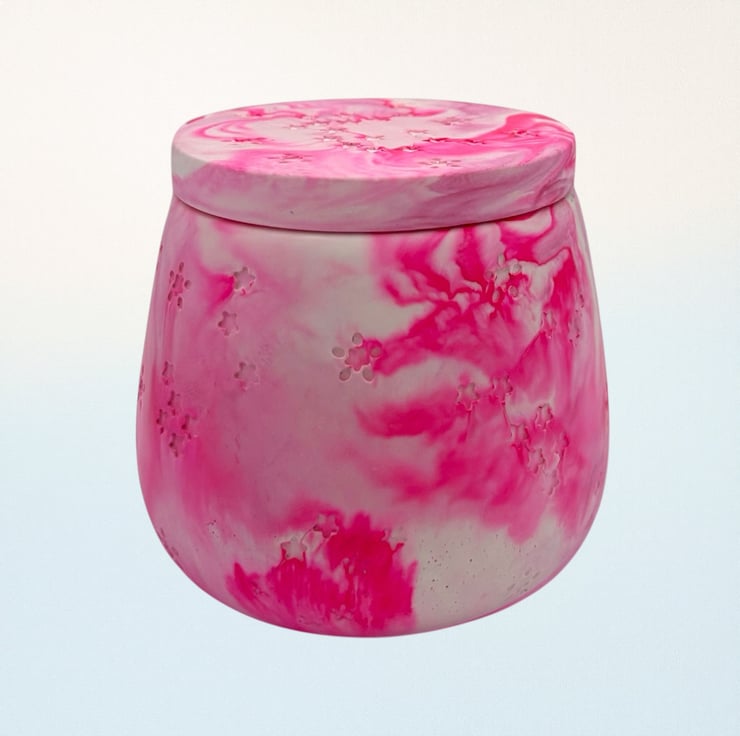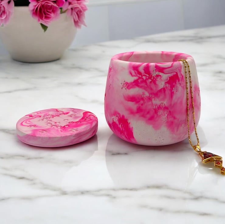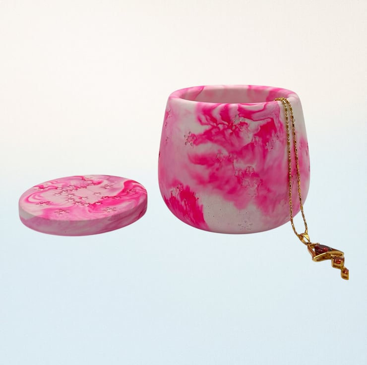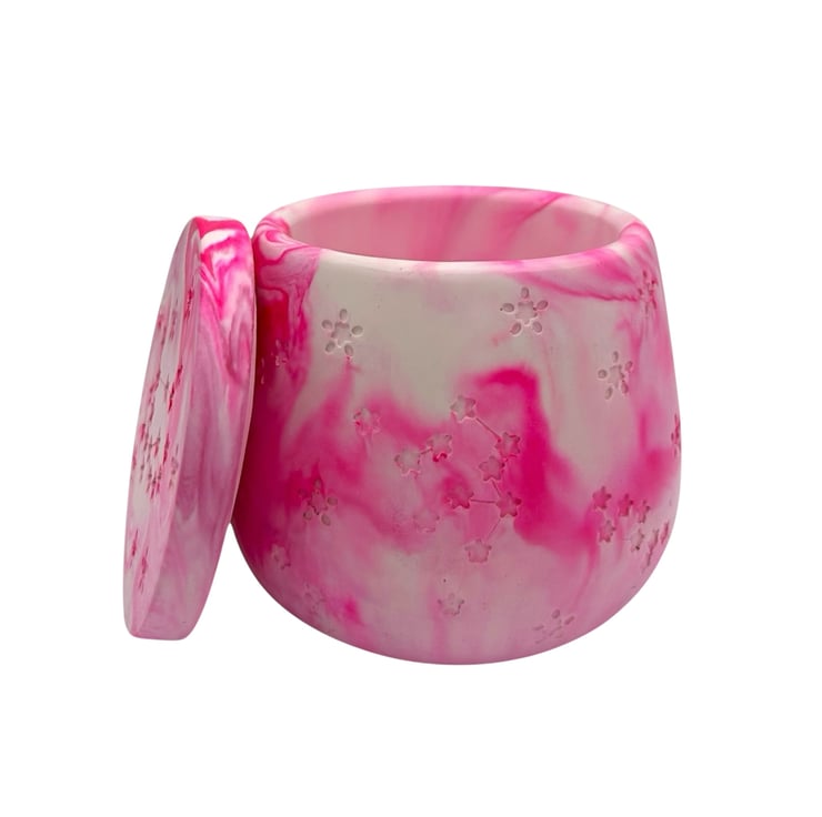 Perfect for storing keepsakes, trinkets, jewellery, or other small treasures, this pot can also serve as a candle jar for tealights or small pillar candles. The lid can be repurposed as a coaster to protect your surfaces from heat. Each pot showcases a unique pink marbling effect, making it a one-of-a-kind piece of art that is ideal as a gift for someone special or as a treat for yourself.
