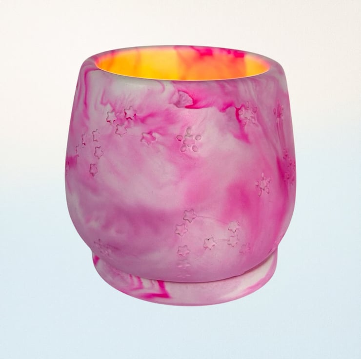 This handmade jewellery pot features a stunning design adorned with stars and constellations, highlighted by a beautiful abstract marbling effect that blends two shades of pink. Crafted from Crystacast, it has a dense, smooth, luxurious finish reminiscent of marble and a lovely, weighty feel.