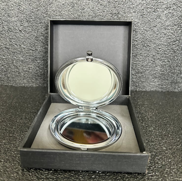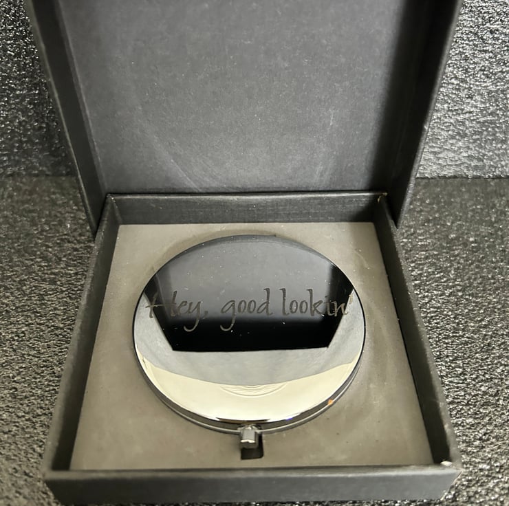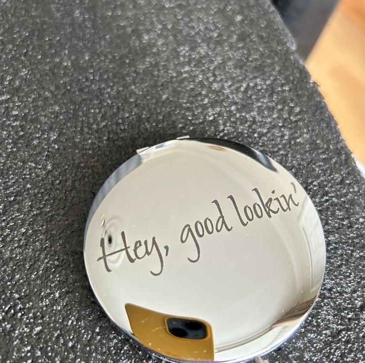 Silver stainless steel compact mirror, comes in a gift box. Engraved with 'Hey good lookin'.