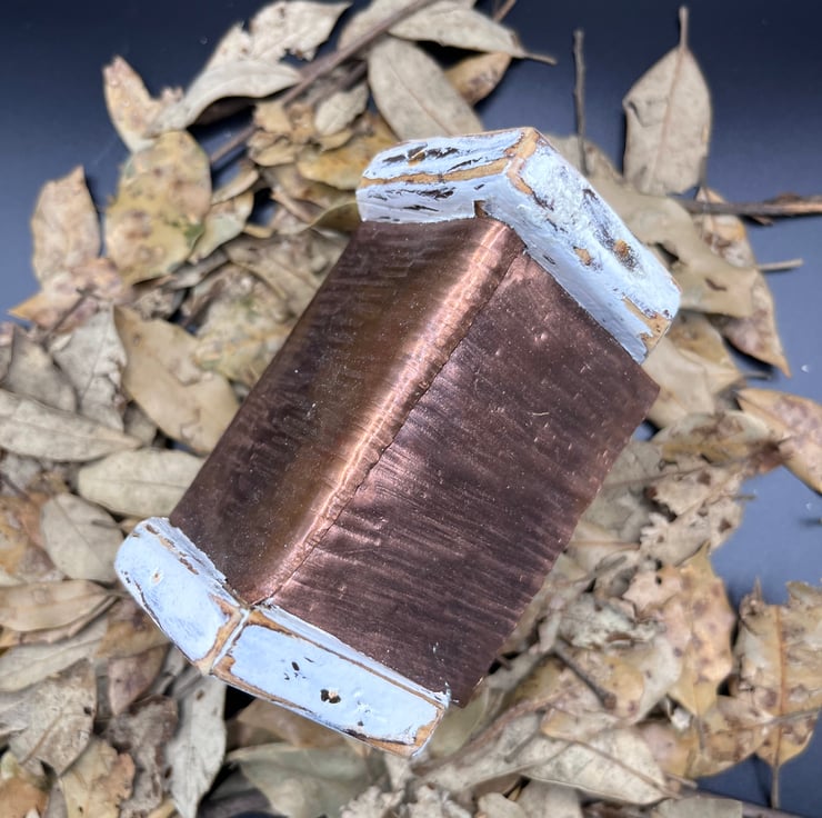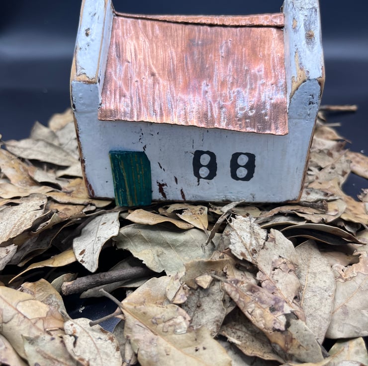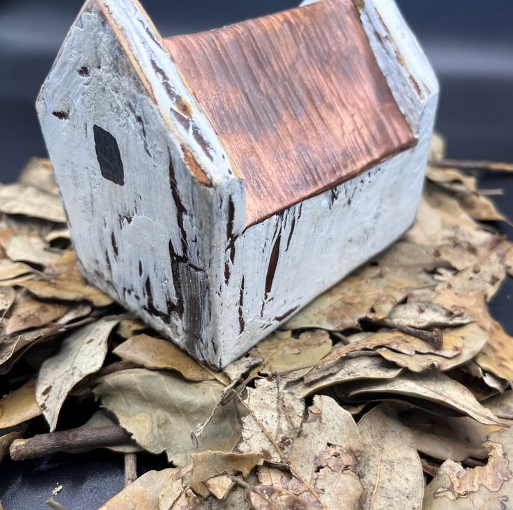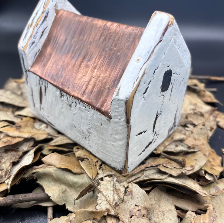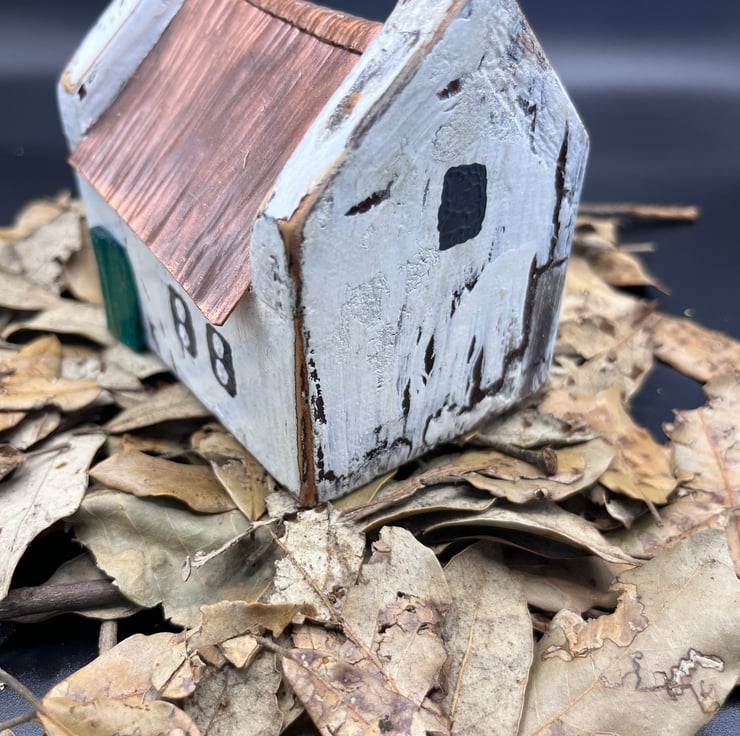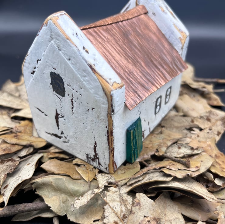 Wooden copper roof miniature house…white painted with a shabby chic finish…a green painted door & painted windows …95mm wide and 65mm & 85mm high approximately…lacquer finish…please be aware this is not a toy …JK 26.