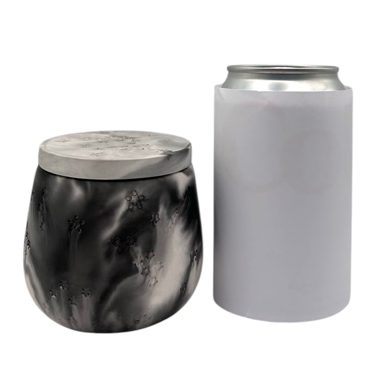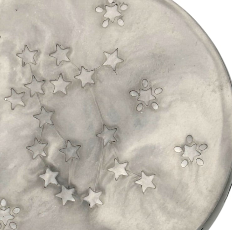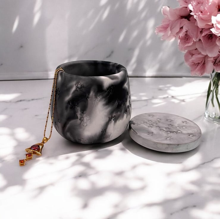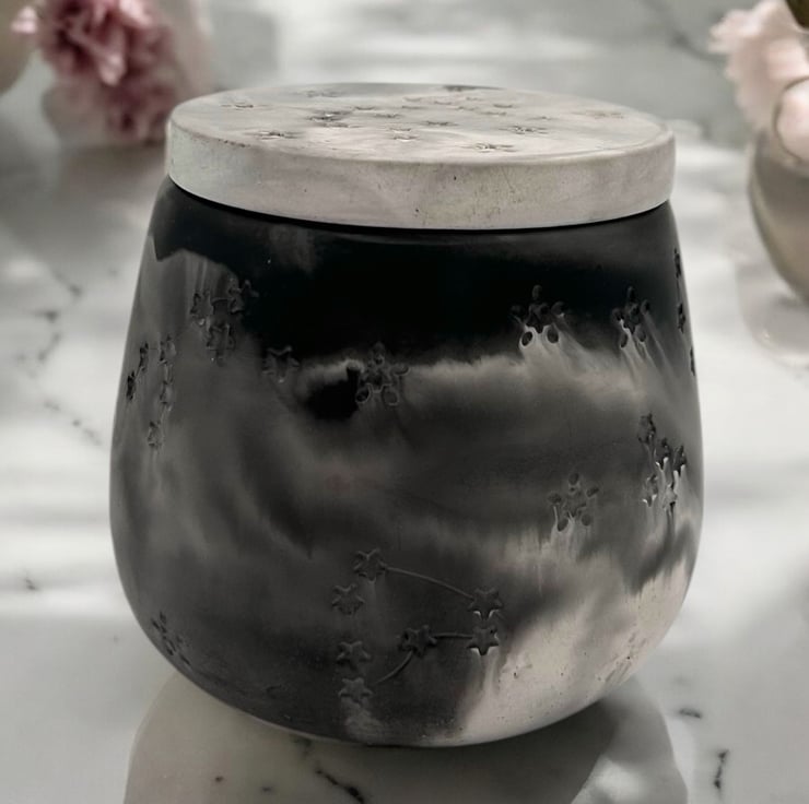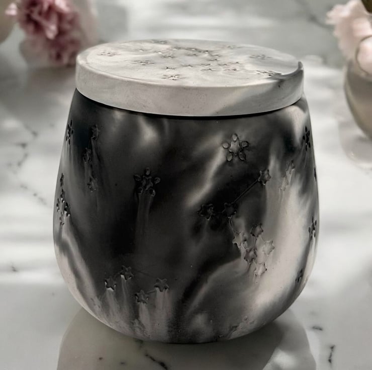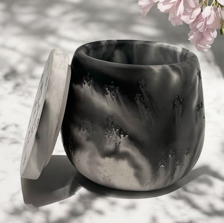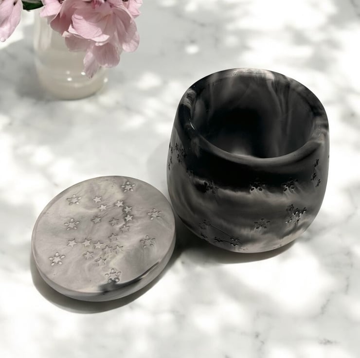 This trinket pot features a decorative design of stars and constellations on both the exterior and the lid. The jewellery box showcases a unique marbling pattern in black, white and grey making every piece one of a kind. Crafted from a premium British plaster known as Crystacast, it has a dense, smooth, and luxurious finish that resembles marble and a lovely weighty feel.