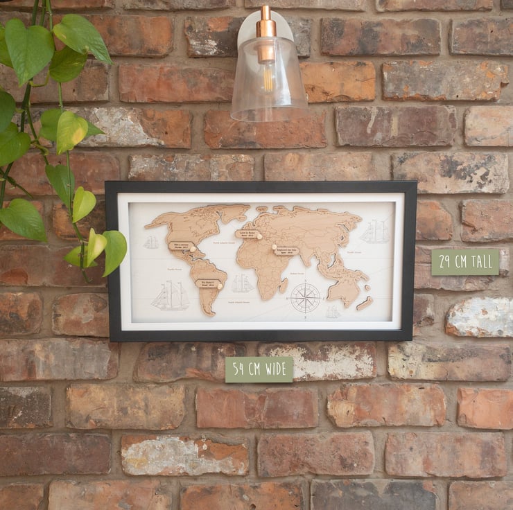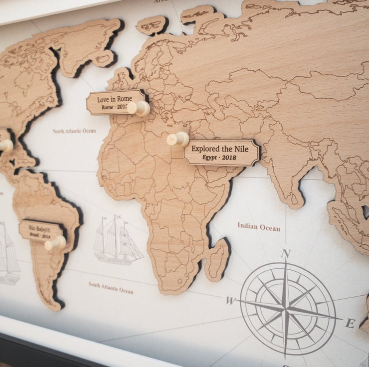 Crafted with precision and care, our wooden world map is a unique canvas for your travel memories. Personalization is at the heart of this map, as you can add up to 10 pins and accompanying wooden place cards. Each pin represents a location significant to you or your loved ones, while the place cards capture the event, location, and year, creating a beautifully curated record of your journeys.