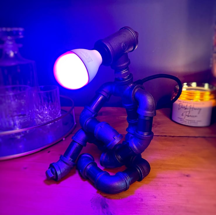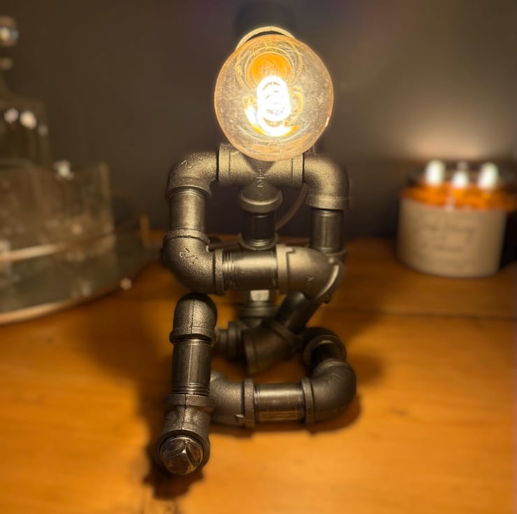 Industrial steampunk robot pipe man lamp for table, bedside, desk or as a bookend