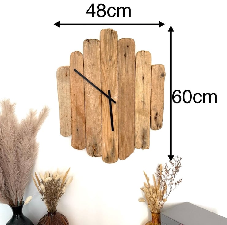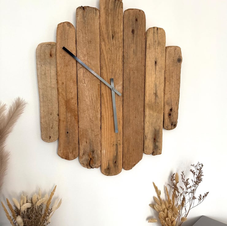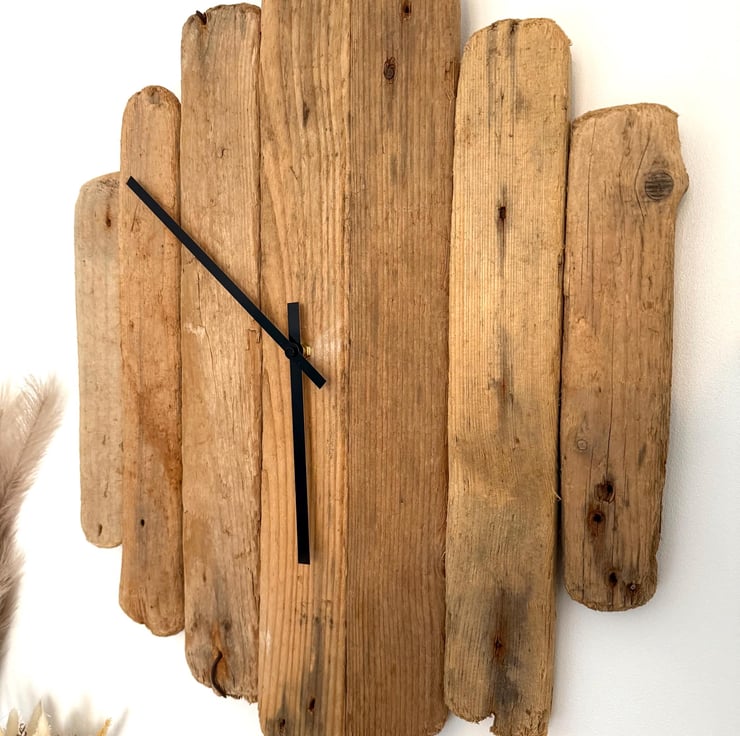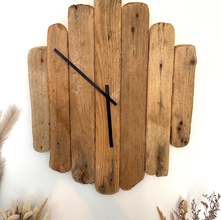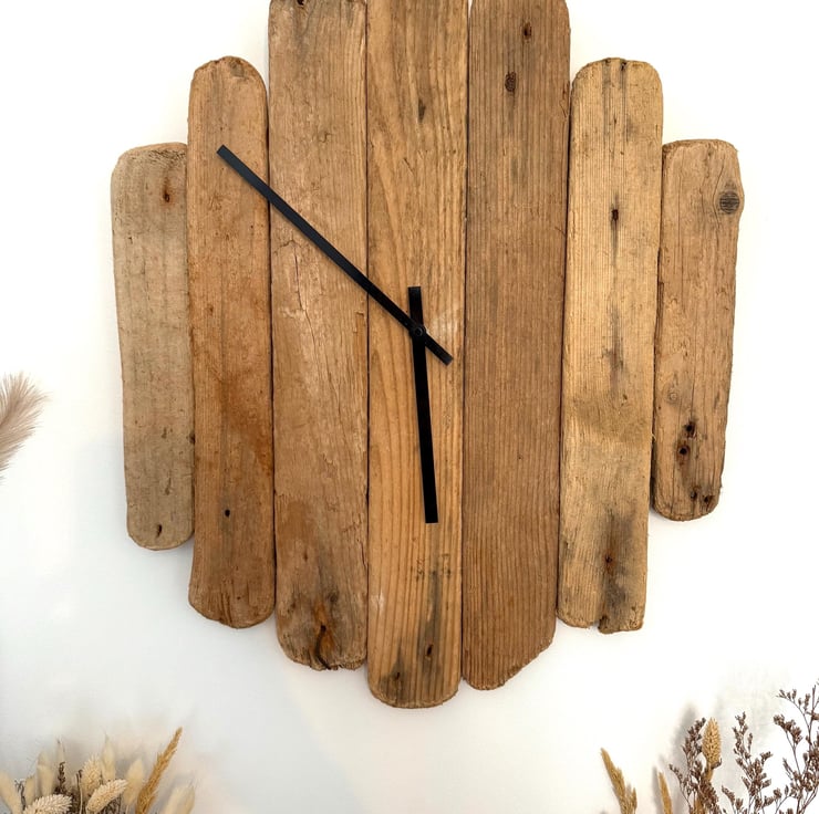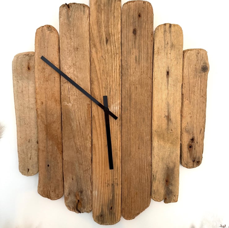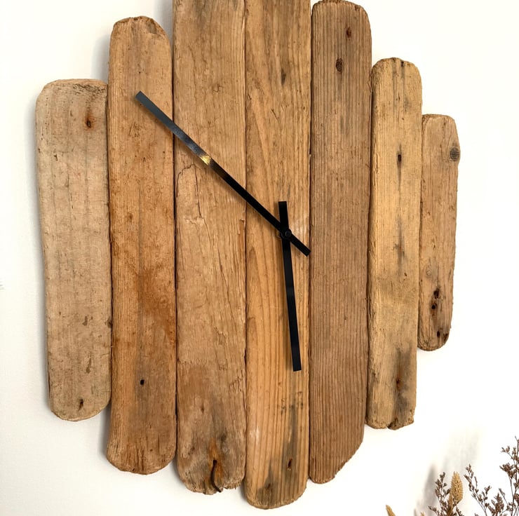 Large wooden wall clock handmade using weathered flat driftwood collected from UK coastline.