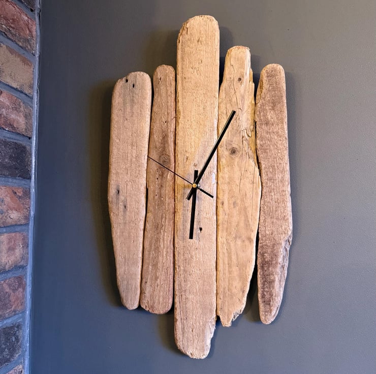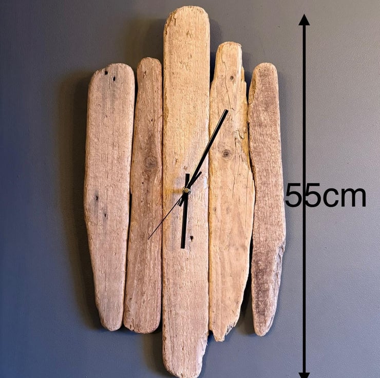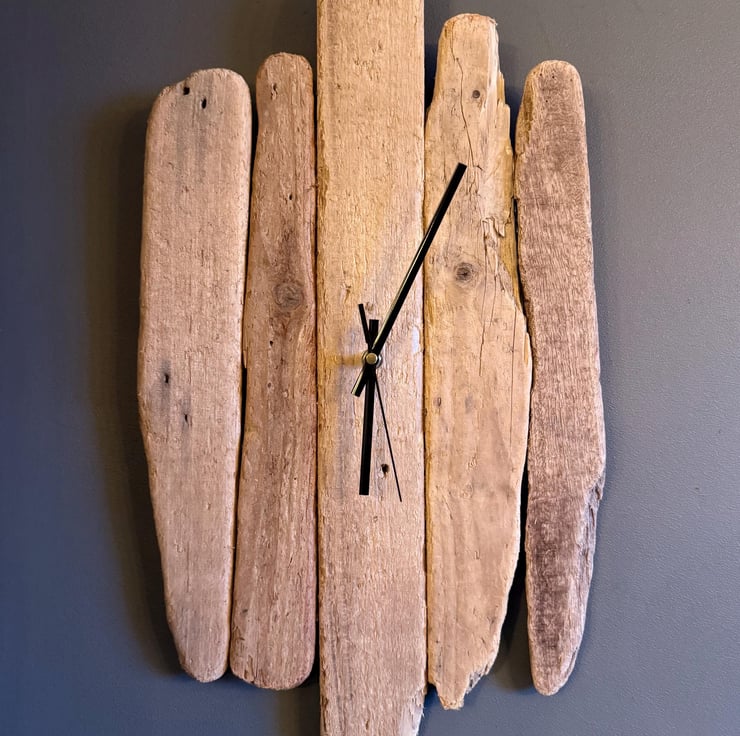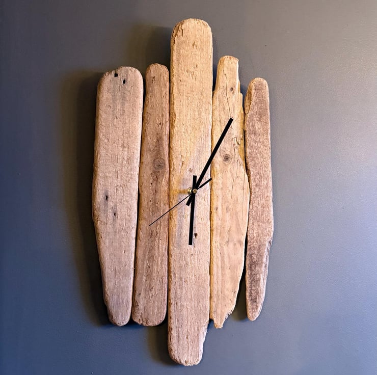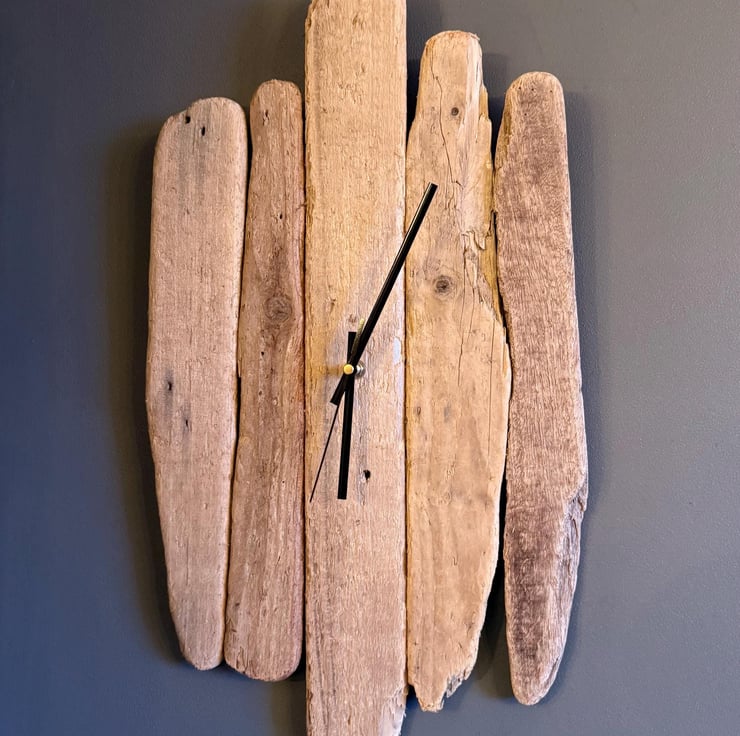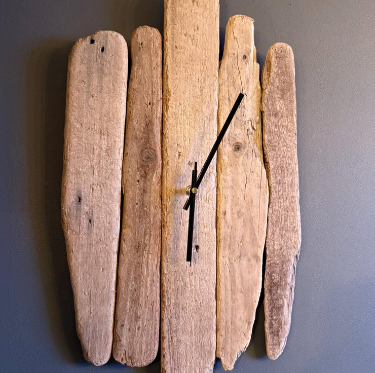 Wooden wall clock handmade using sea weathered flat wood collected from UK coastline.