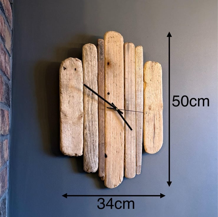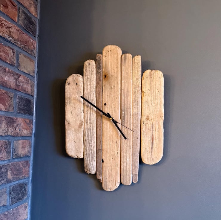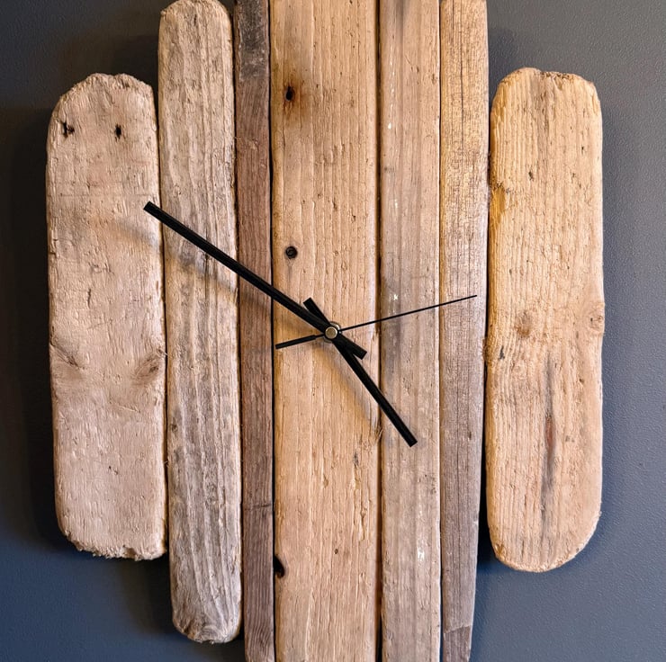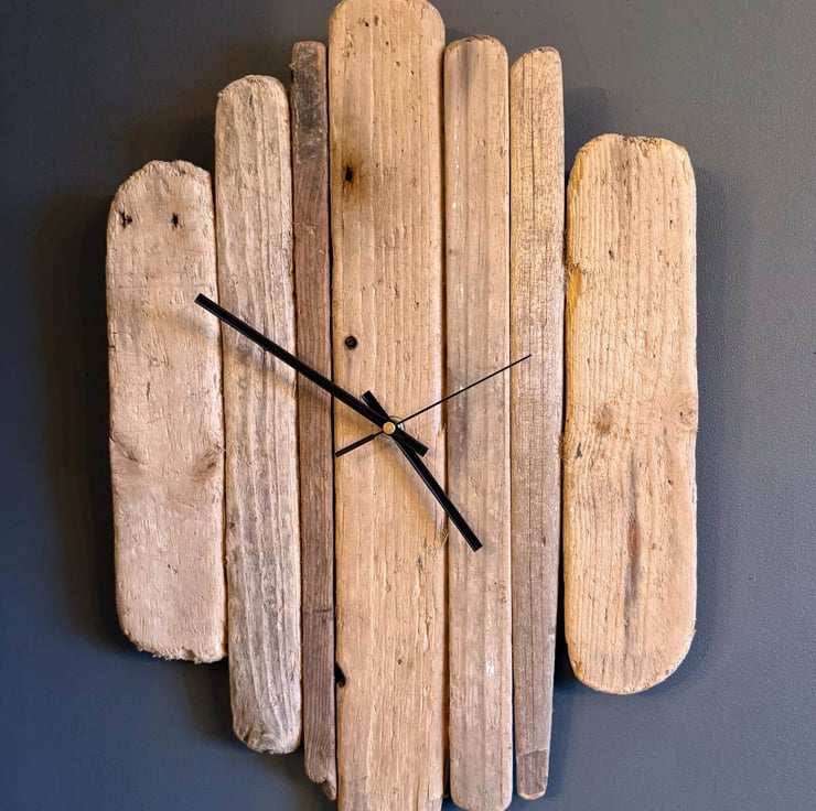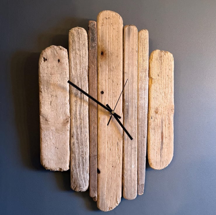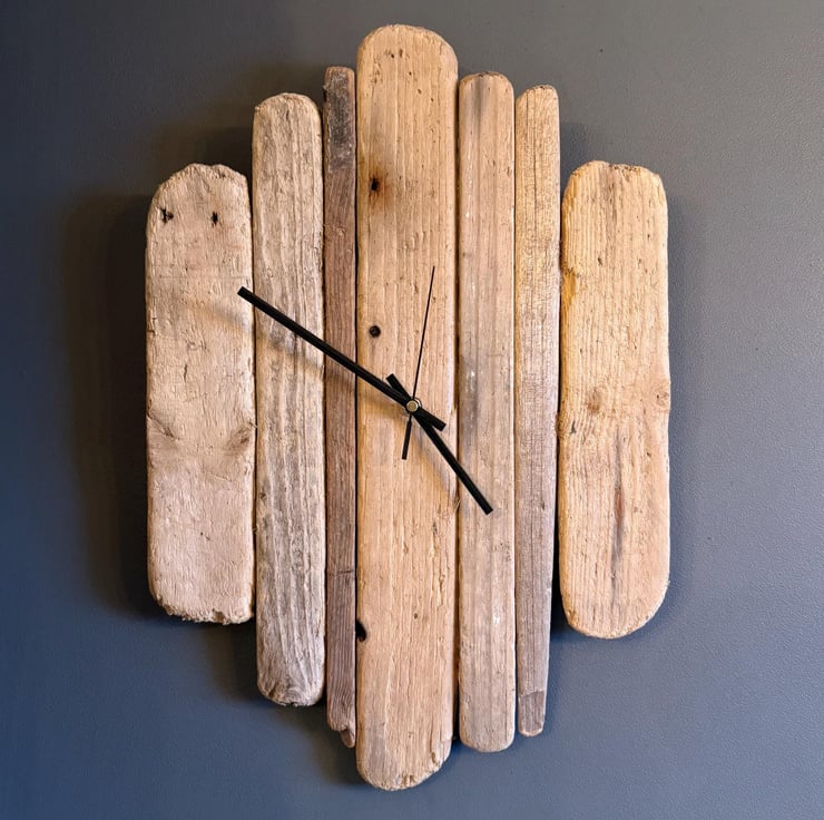 Wooden wall clock handmade using weathered flat driftwood collected from UK coastline.